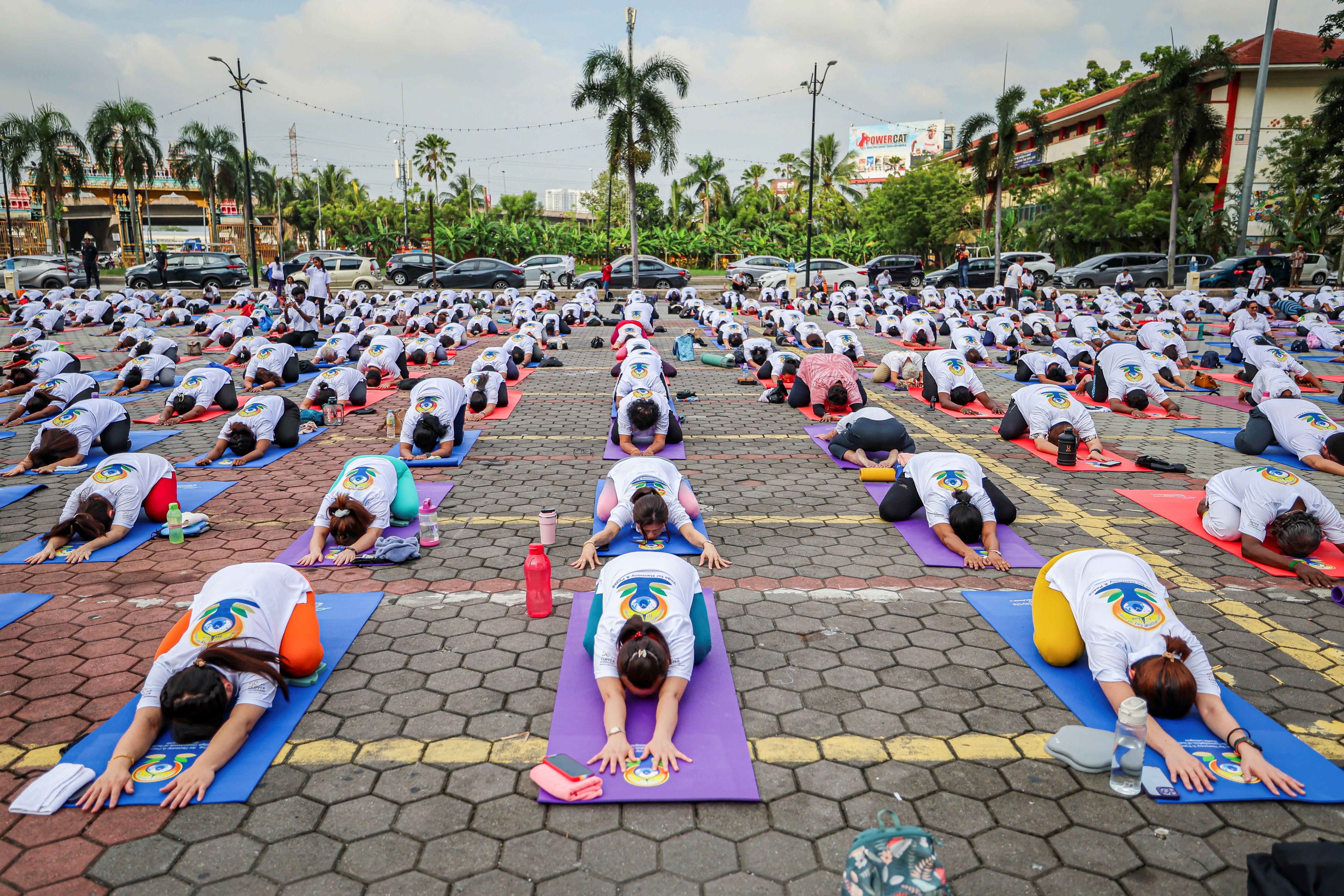 Yoga practitioners take part in a mass yoga session on the 10th International Day of Yoga at Batu Caves, Malaysia, on June 21, 2024. (Photo by Annice Lyn/Reuters)