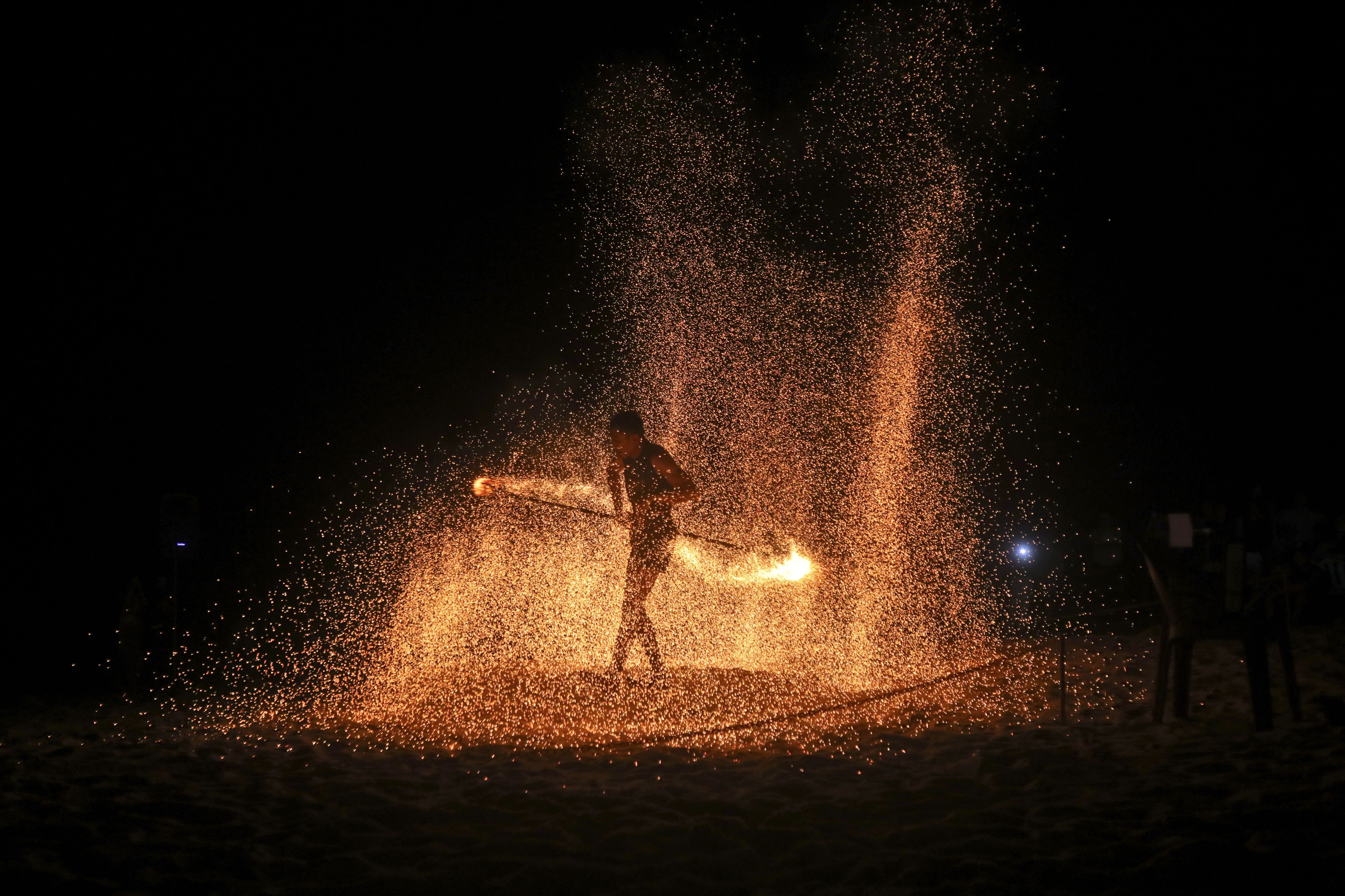 A fire dancer performs during a show for tourists on Batu Ferringhi Beach on Penang Island, Malaysia, Thursday, July 11, 2024. (Photo by Binsar Bakkara/AP Photo)