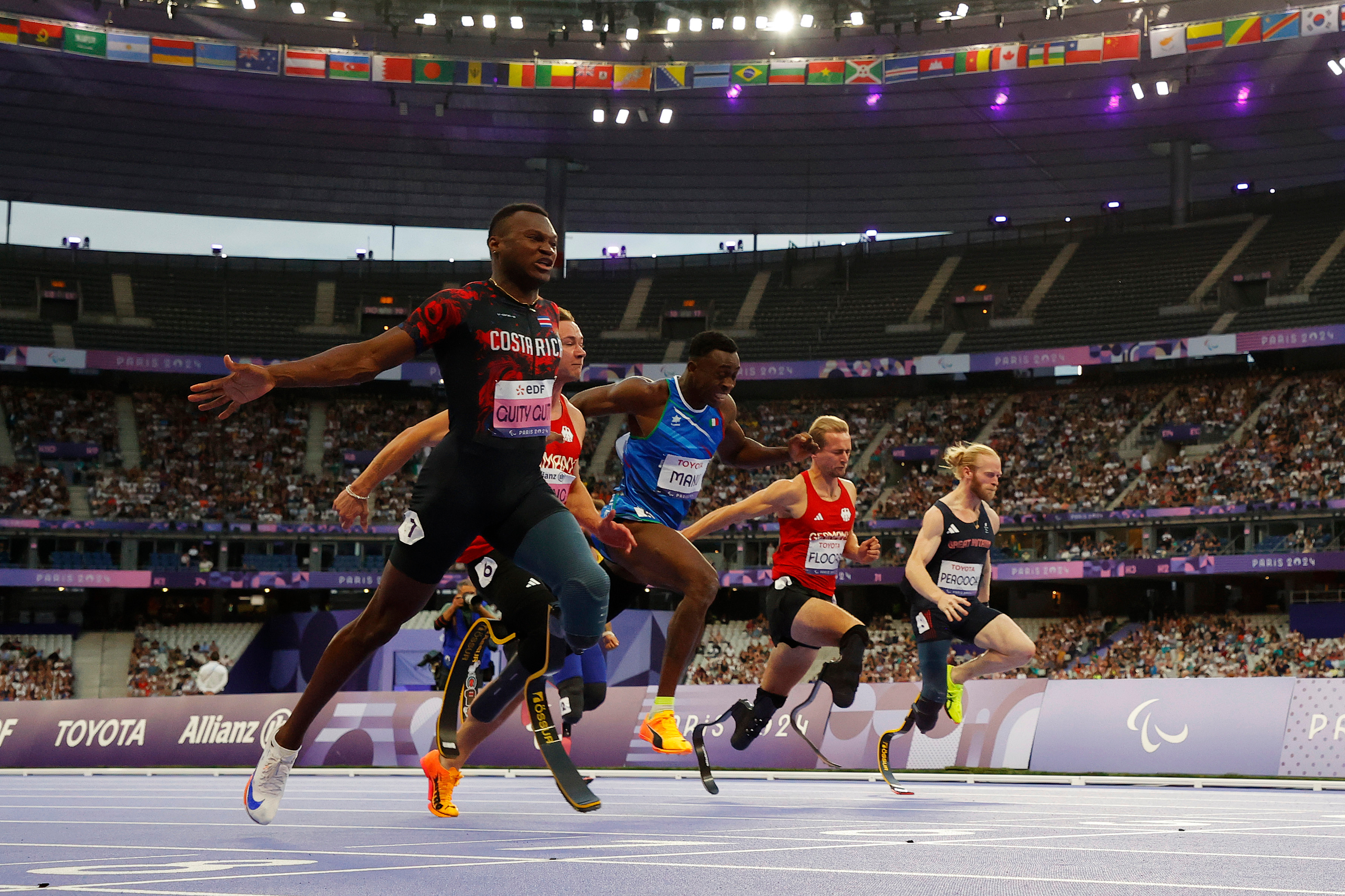 Sherman Isidro Guity Guity of Team Costa Rica crosses the finish line to win gold in the Men's 100m - T64 Final on day five of the Paris 2024 Summer Paralympic Games at Stade de France on September 02, 2024 in Paris, France. (Photo by Tom Jenkins/The Guardian)