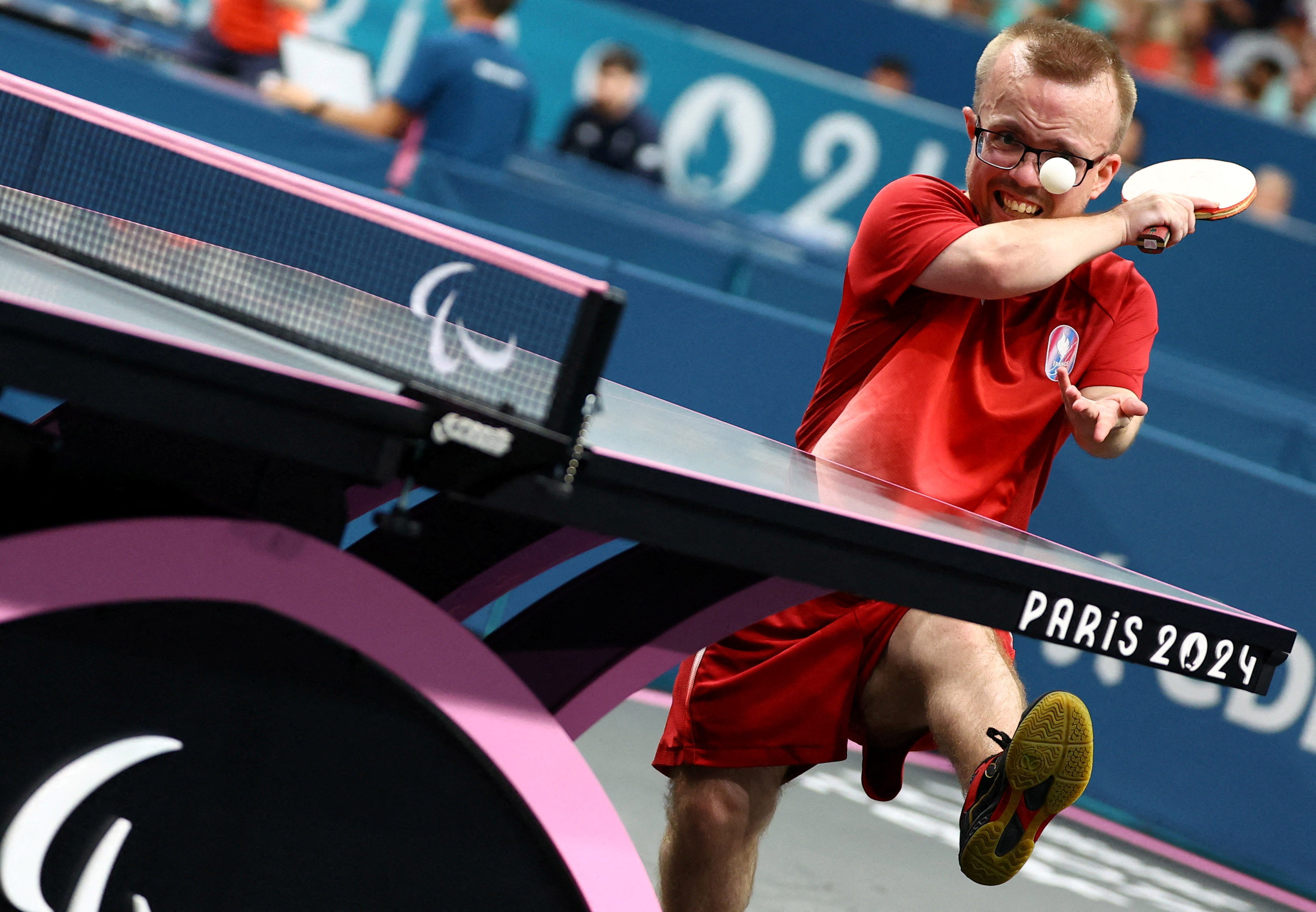 Thomas Bouvais of France in action during his men's singles table tennis match against Viktor Didukh of Ukraine on September 2, 2024. (Photo by Kacper Pempel/Reuters)