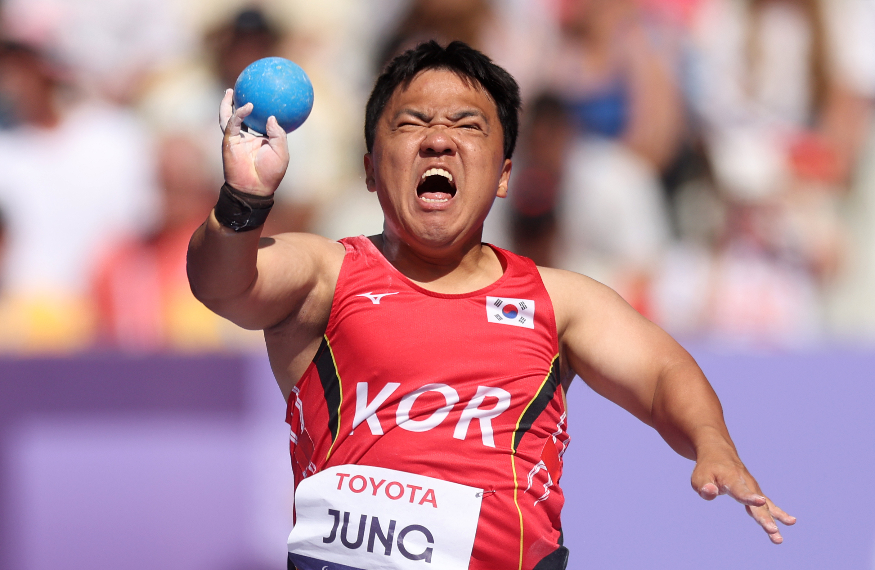 Jisong Jung of Team Republic of Korea competes during the Men's Shot Put F41 Final on day five of the Paris 2024 Summer Paralympic Games at Stade de France on September 02, 2024 in Paris, France. (Photo by Ezra Shaw/Getty Images)