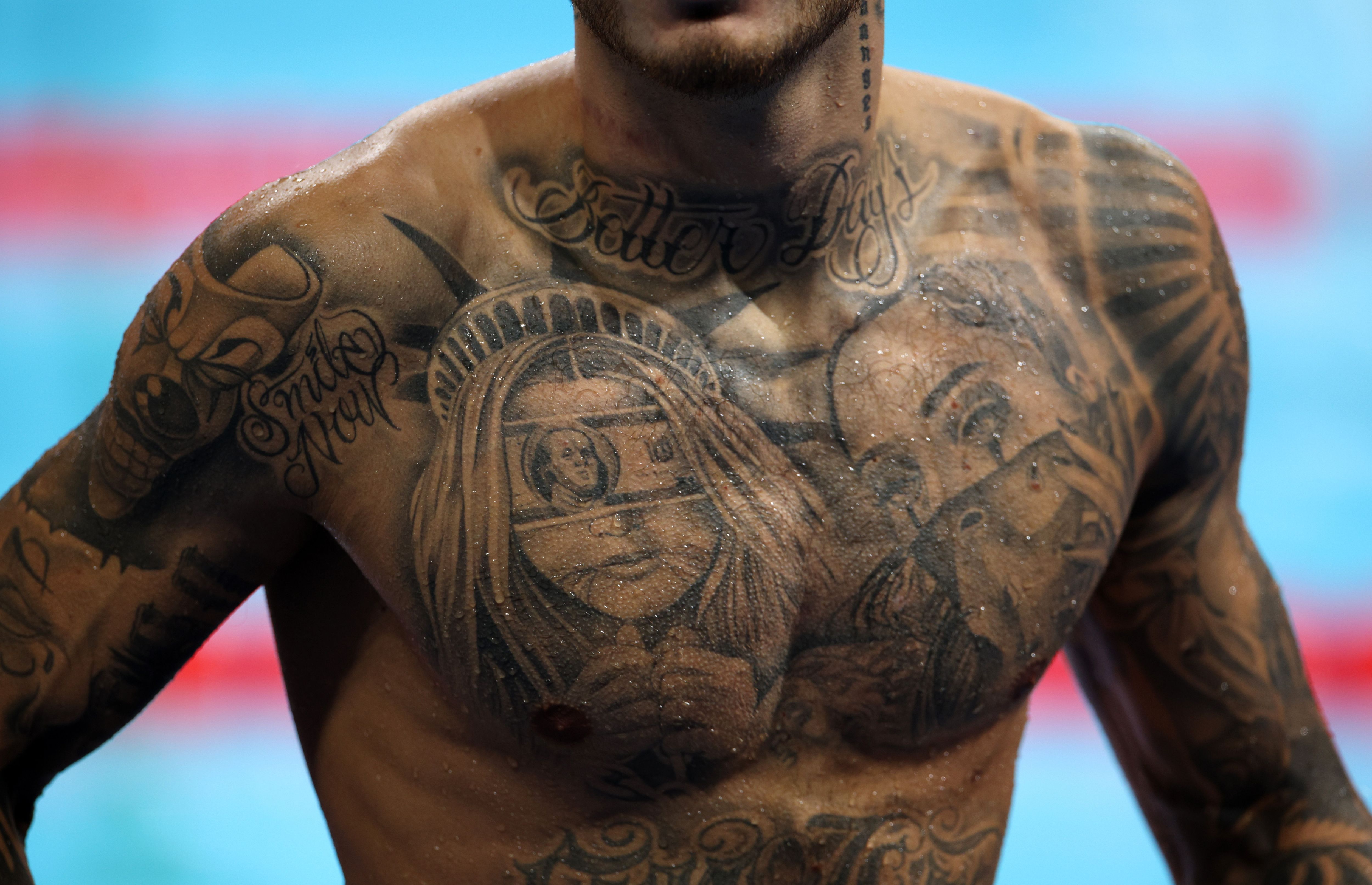 Detailed view of the tattoed chest of Manuel Mateo Bortuzzo of Team Italy on day five of the Paris 2024 Summer Paralympic Games at Paris La Defense Arena on September 02, 2024 in Nanterre, France. (Photo by Adam Pretty/Getty Images)