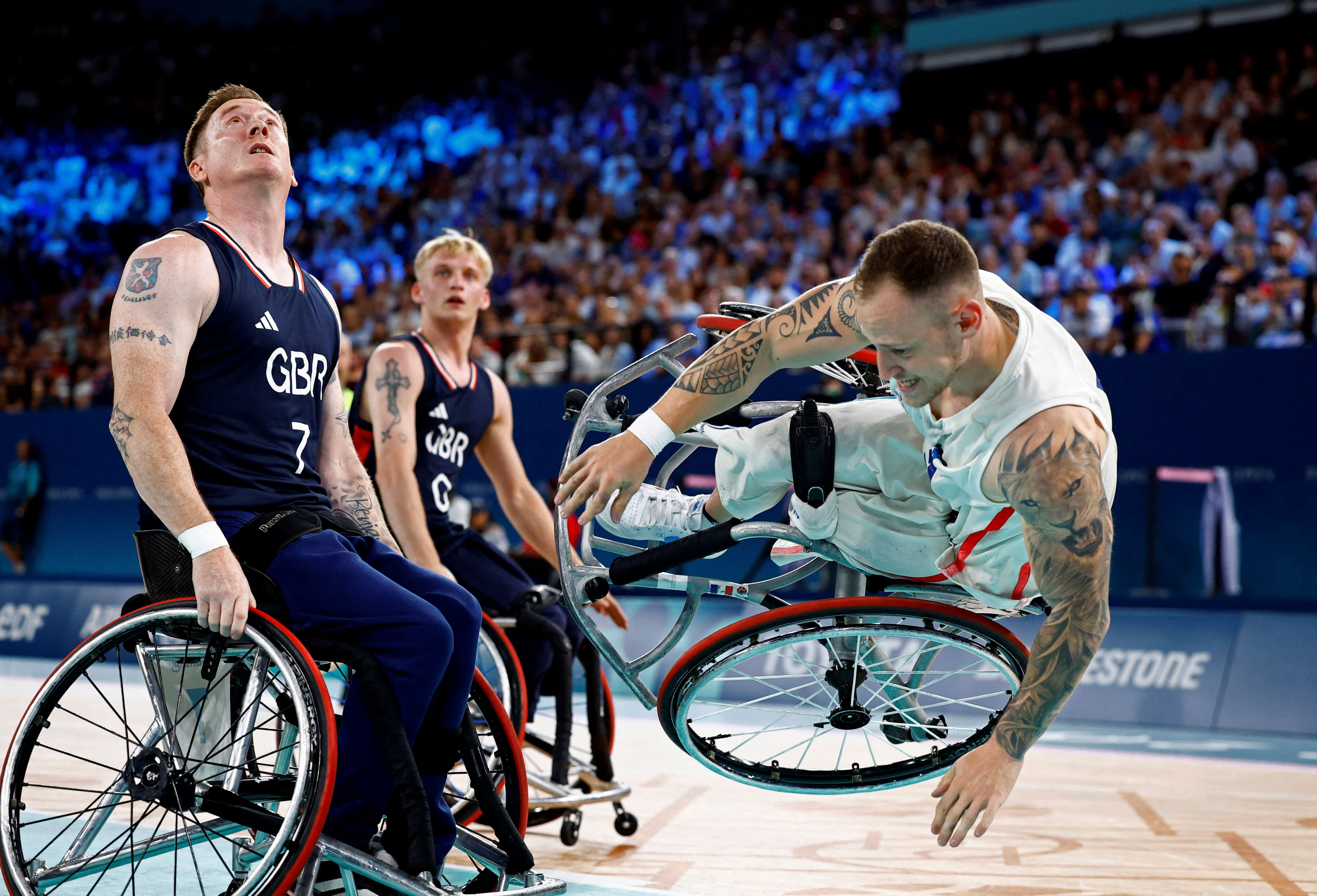 Alexis Ramonet of France falls during France v Britain wheelchair basketball on September 2, 2024. (Photo by Carlos Garcia Rawlins/Reuters)