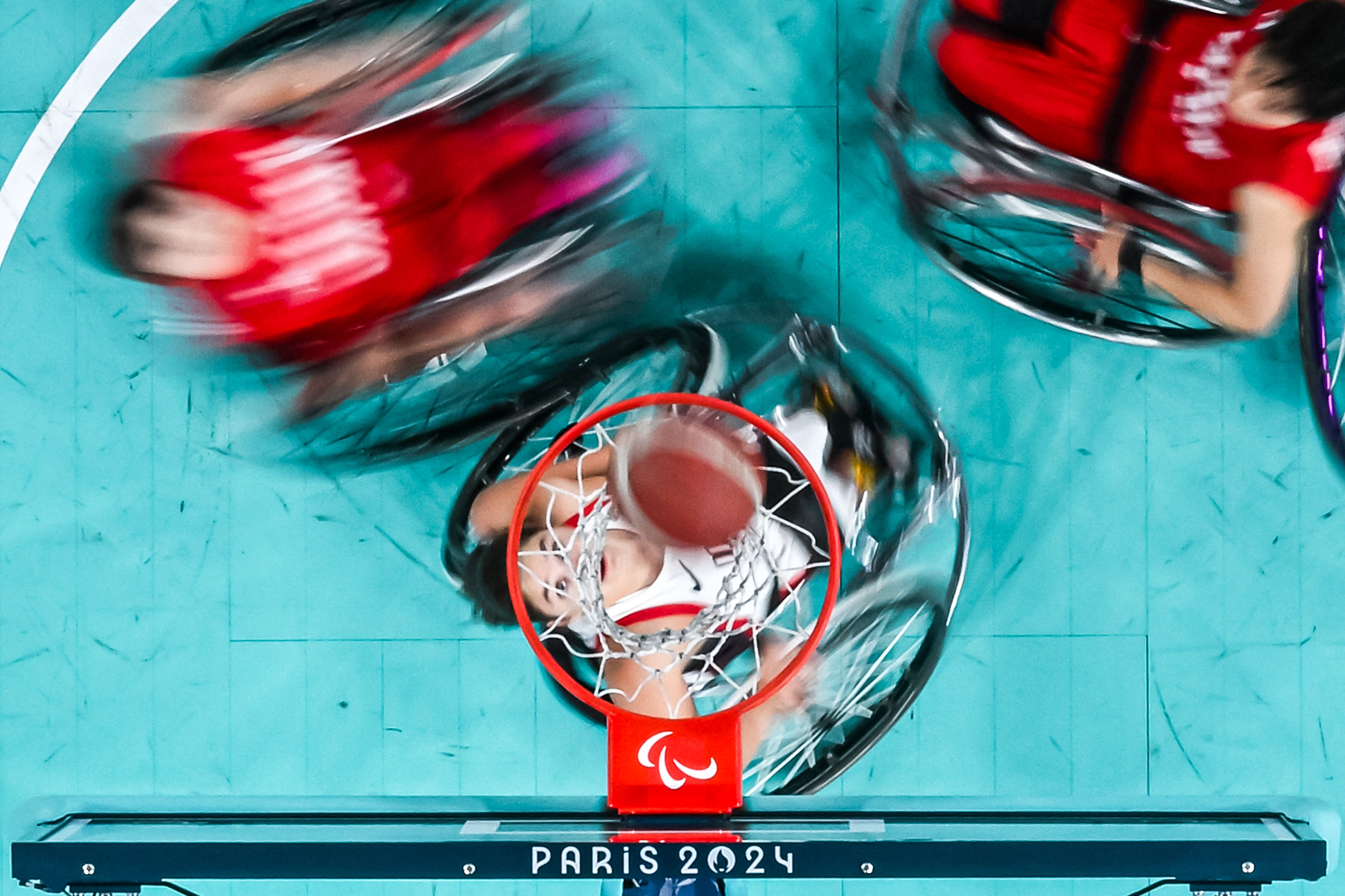 An overview shows USA's Becca Murray (C) and Japan's players competing in the Women's Wheelchair Basketball Preliminary Round Group B Game #21, during the Paris 2024 Paralympic Games at the Bercy Arena in Paris on September 02, 2024. (Photo by François-Xavier Marit/AFP Photo)