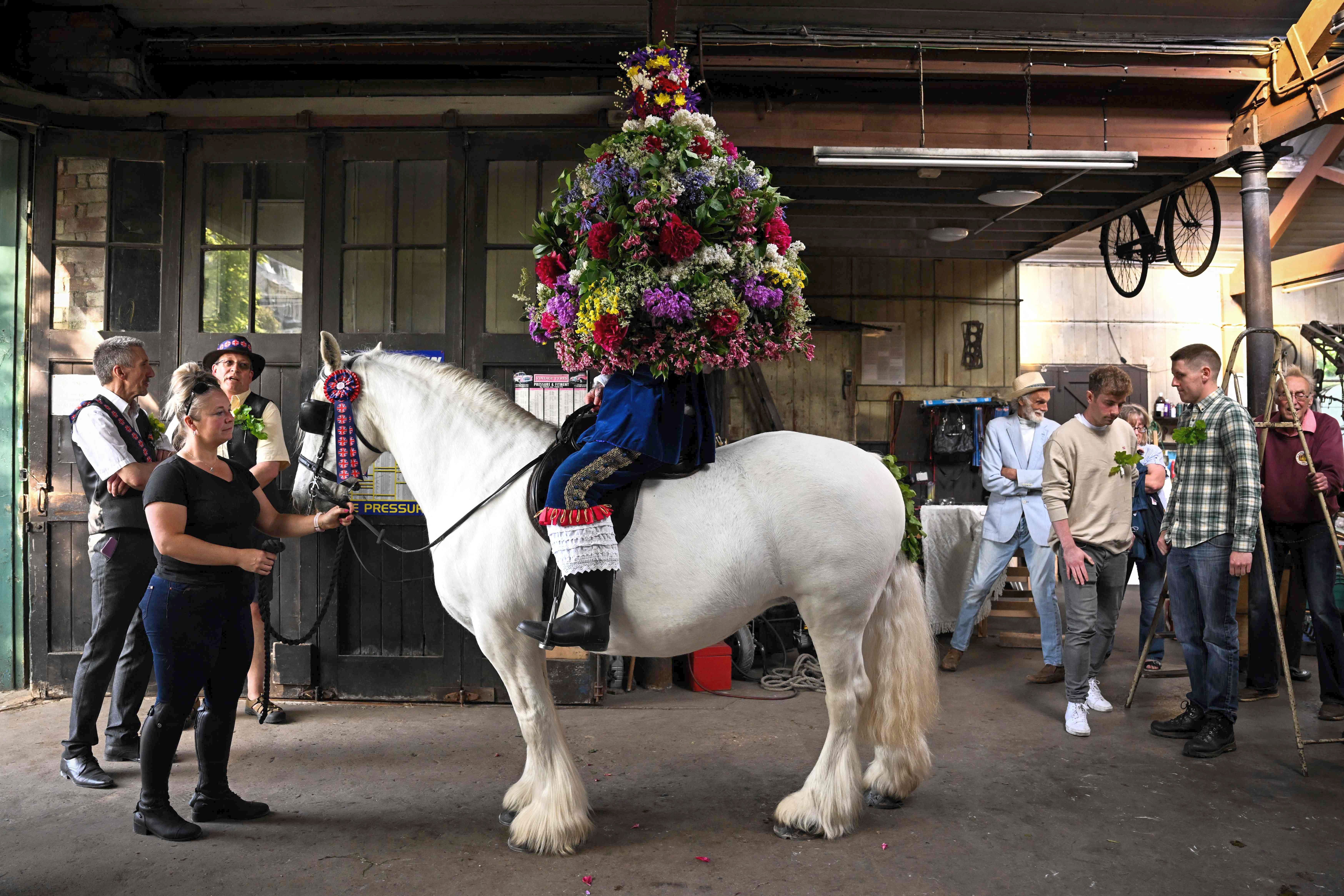 John Turner, the 'King' of Castleton Garland Day, on horse-back, covered to the waist in a heavy, bell-shaped floral Garland, prepares to parade through the village of Castleton in the Peak District, northern England on May 29, 2023. The date of the custom coincides with Oak Apple Day and it is said to commemorate the restoration of King Charles II in 1660. The Garland is meant to represent the oak tree in which he hid after the Battle of Worcester. (Photo by Oli Scarff/AFP Photo)