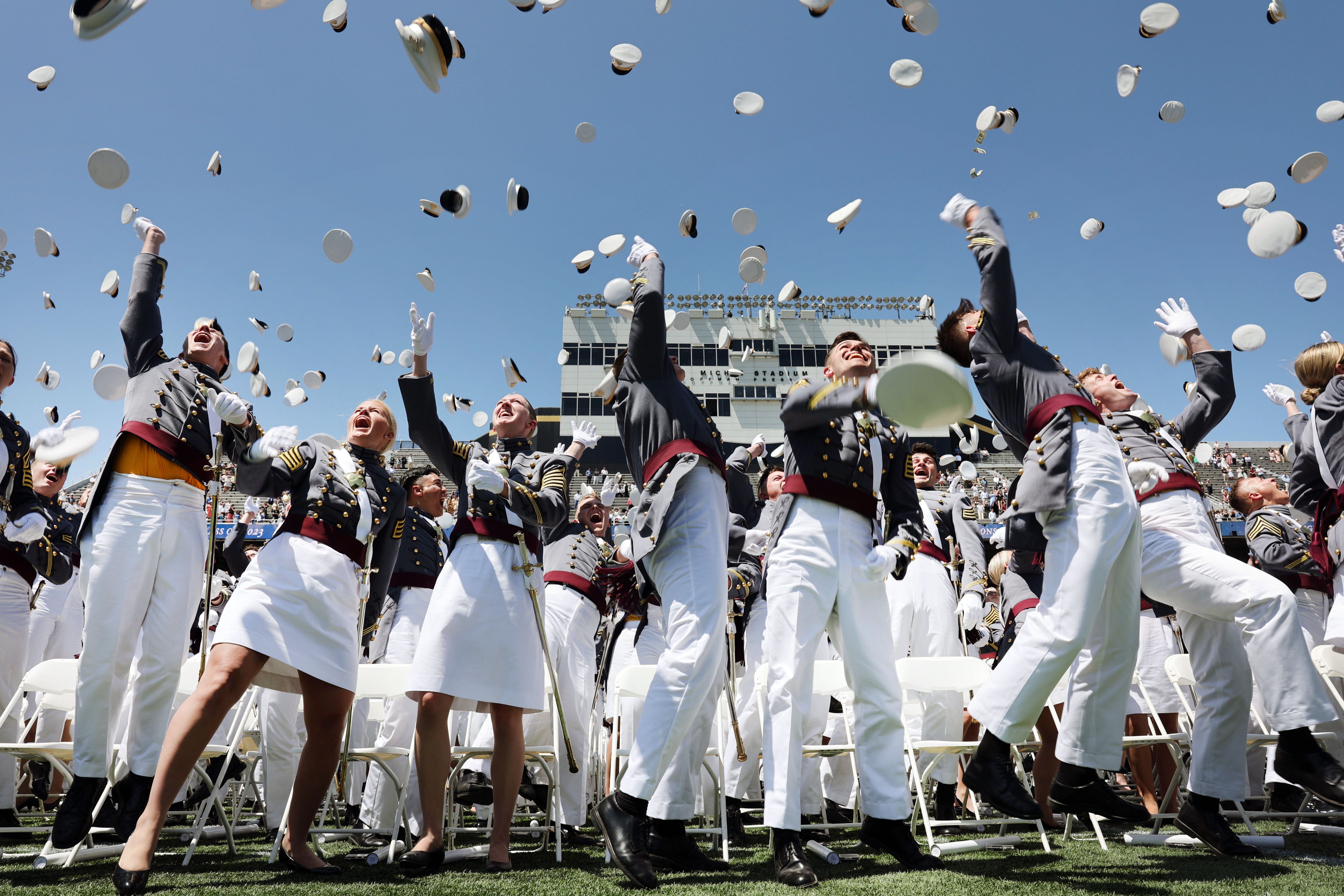 Graduation cadets toss their hats into the air following the conclusion of ceremonies at Michie Stadium at West Point's graduation on May 27, 2023 in West Point, New York. Vice President Kamala Harris will deliver the keynote speech at the ceremony, becoming the first woman to give a commencement address in the military academy's 221-year history. (Photo by Spencer Platt/Getty Images)