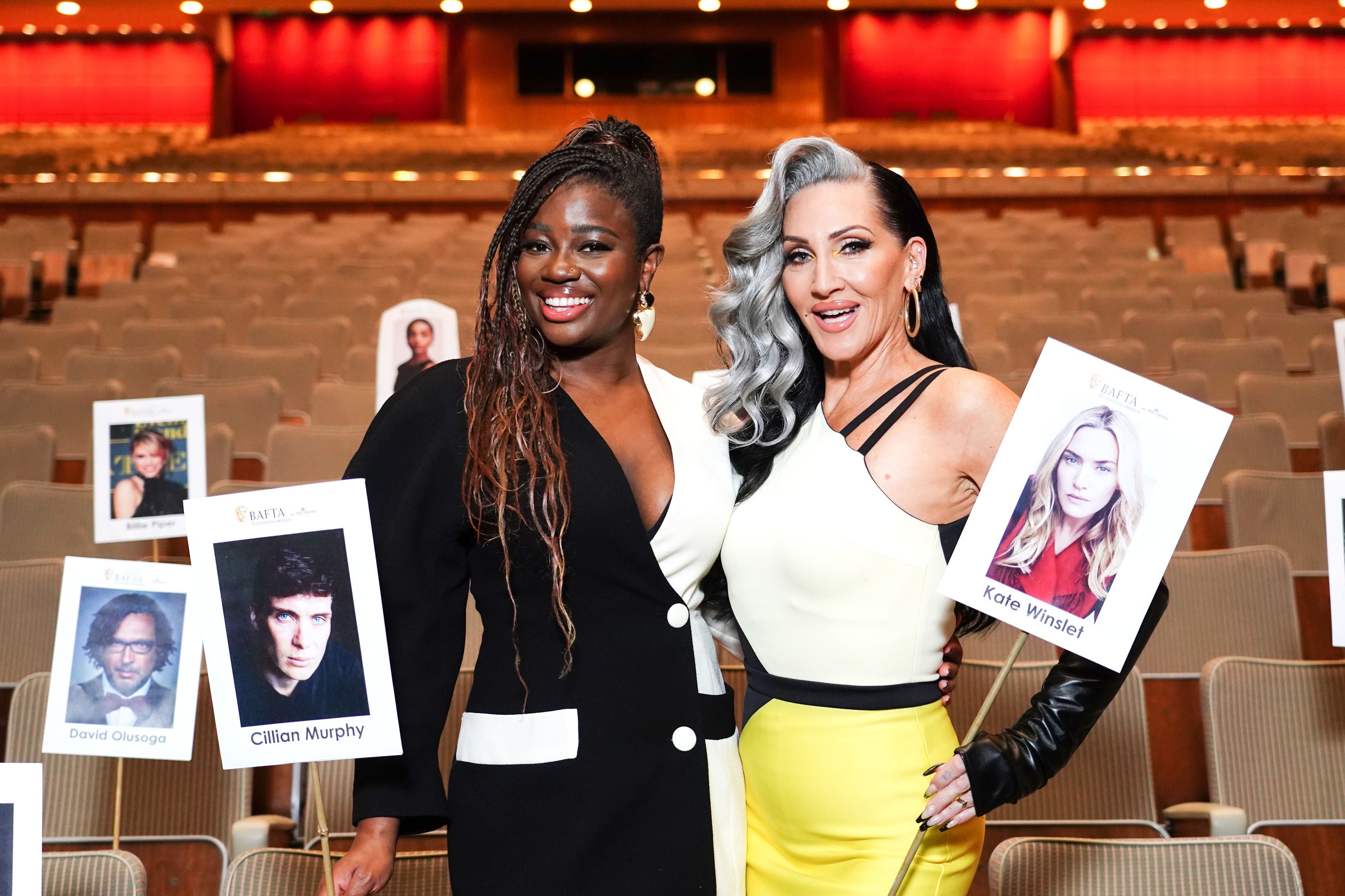 British radio broadcaster Clara Amfo (left) and American singer and television host Michelle Visage are seen at a “heads on sticks” photocall at the Royal Festival Hall in London on Tuesday, May 9, 2023 ahead of the BAFTA Television Awards on Sunday. (Photo by IAN WEST/PA Images via Getty Images)