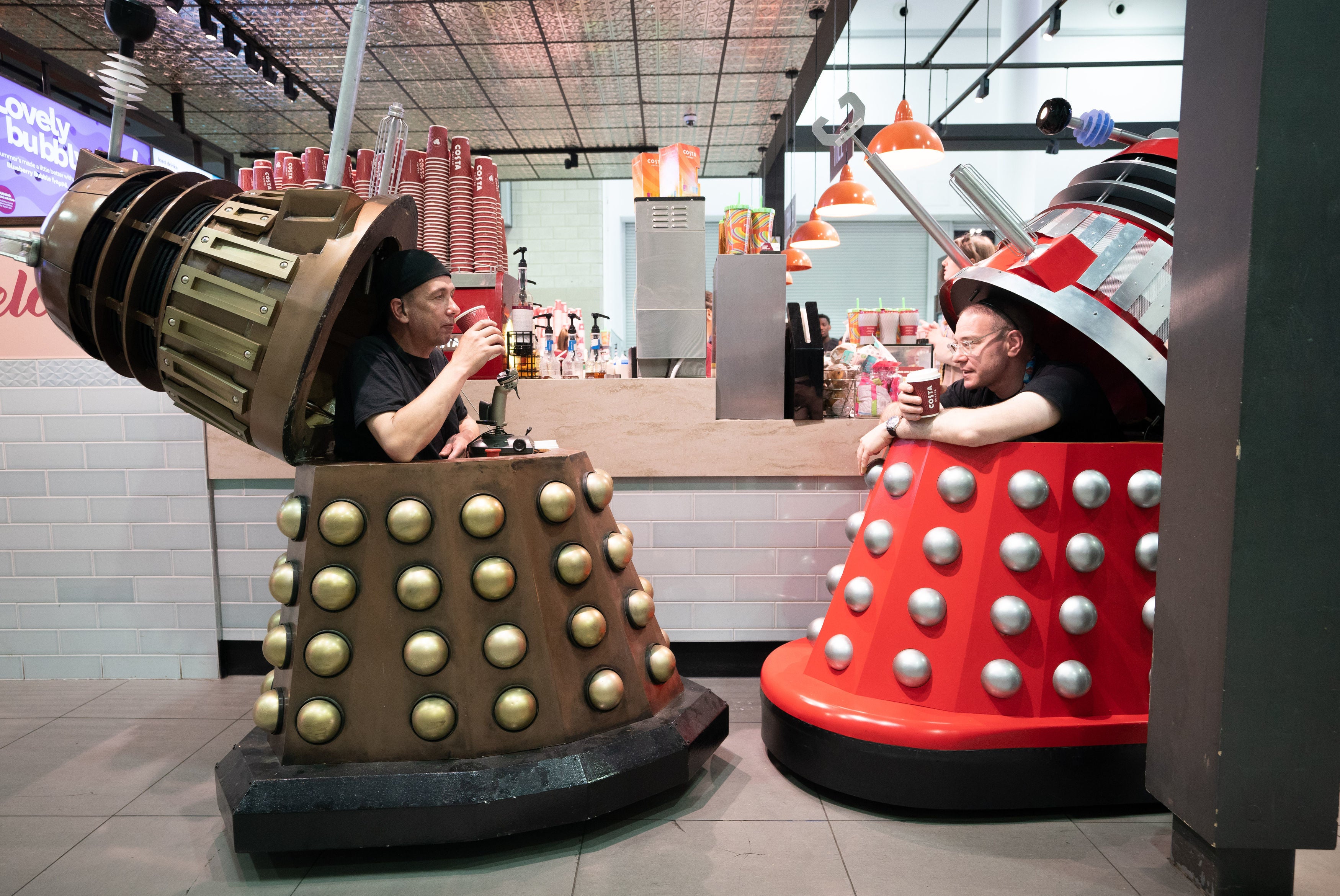 People drink coffee inside Daleks during MCM Comic Con at the ExCel London in east London on Friday, May 26, 2023. (Photo by James Manning/PA Images via Getty Images)