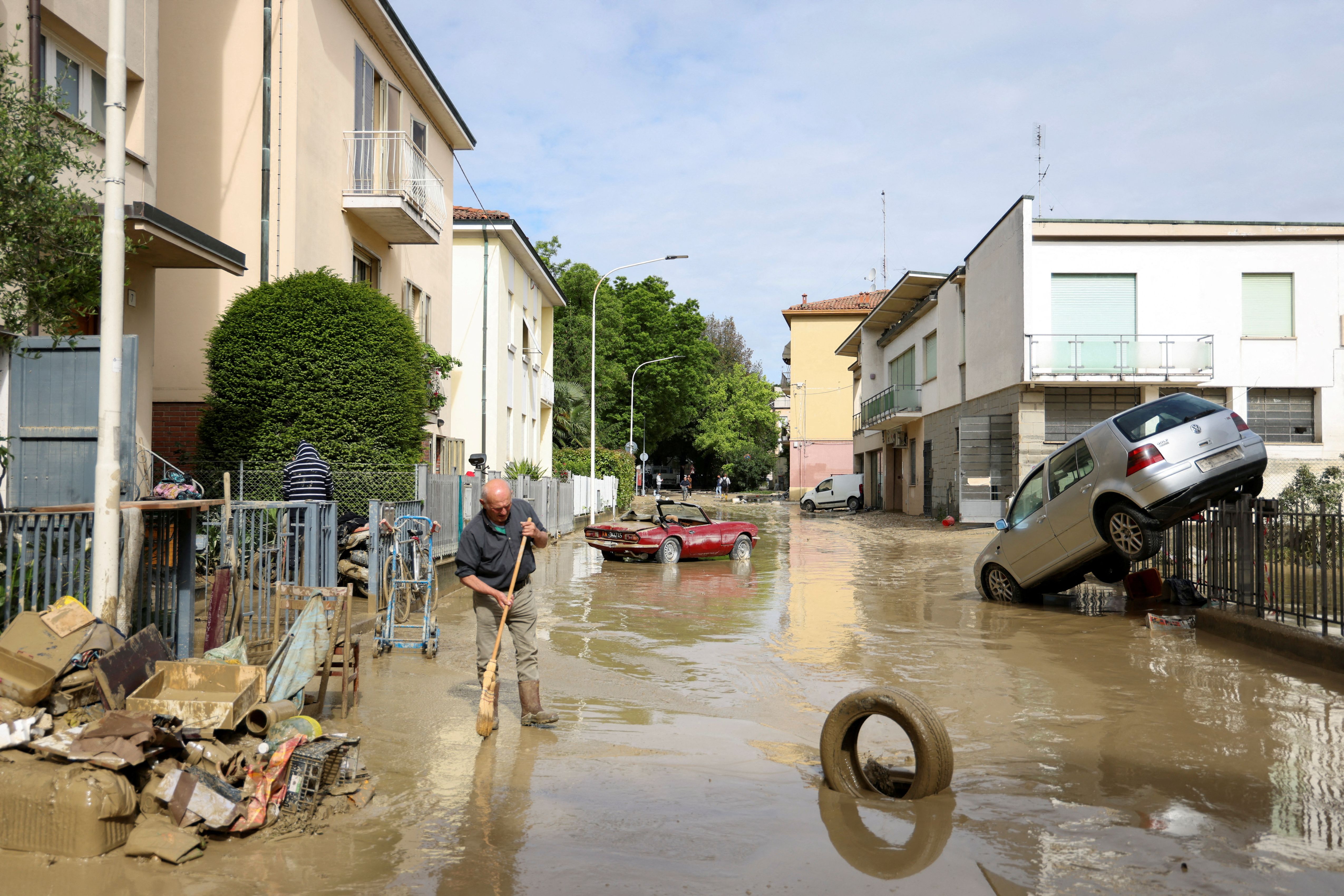 A resident removes mud and debris after heavy rains hit Italy's Emilia Romagna region, in Faenza, Italy on May 18, 2023. (Photo by Claudia Greco/Reuters)