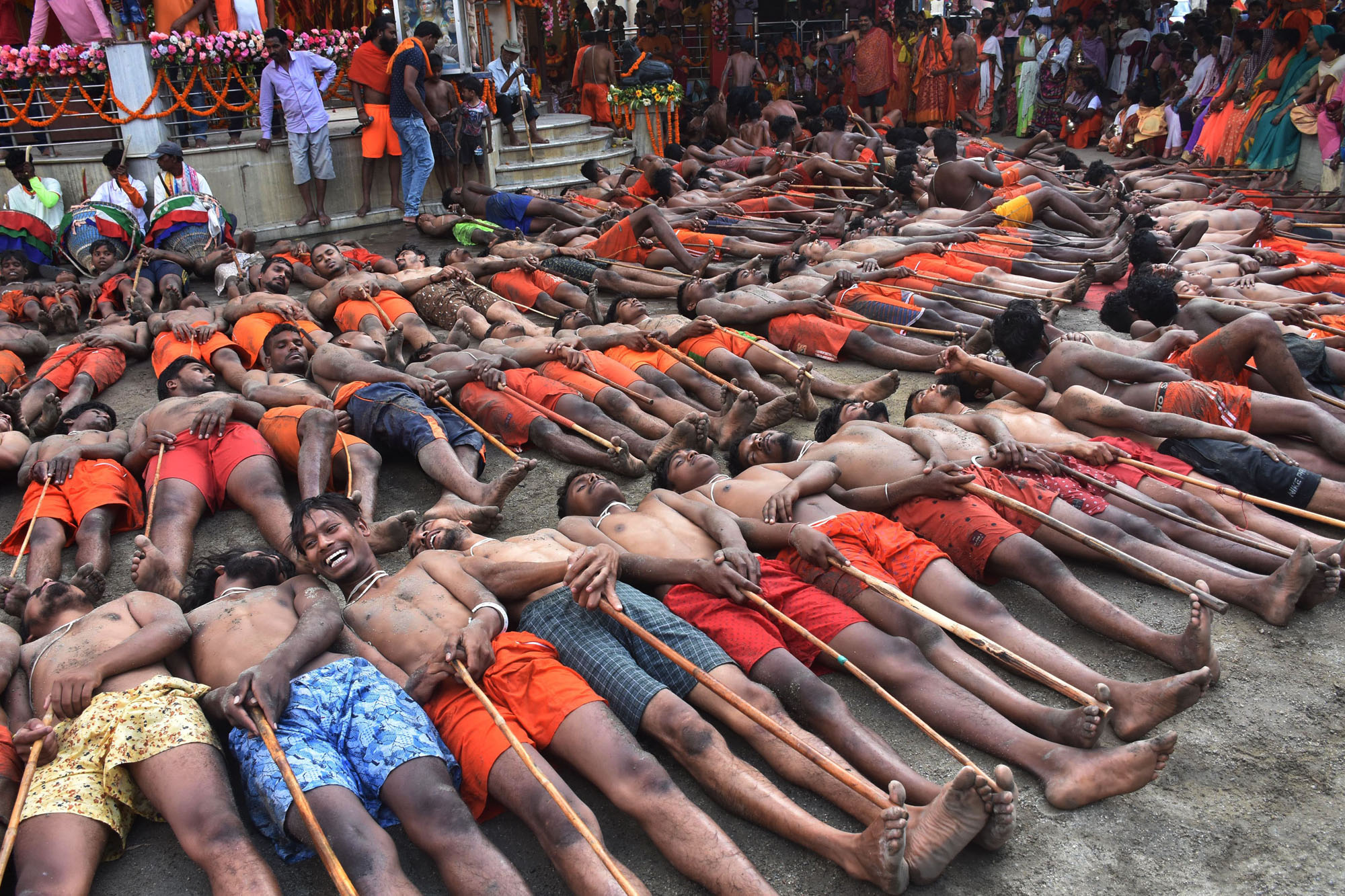 Hindu devotees lie on the ground as they wait for blessings from a priest to have good crop, prosperity and peace during the “Manda Puja” festival outside the Hindu Lord Shiva Temple in Ranchi on May 5, 2023. (Photo by Rajesh Kumar/AFP Photo)