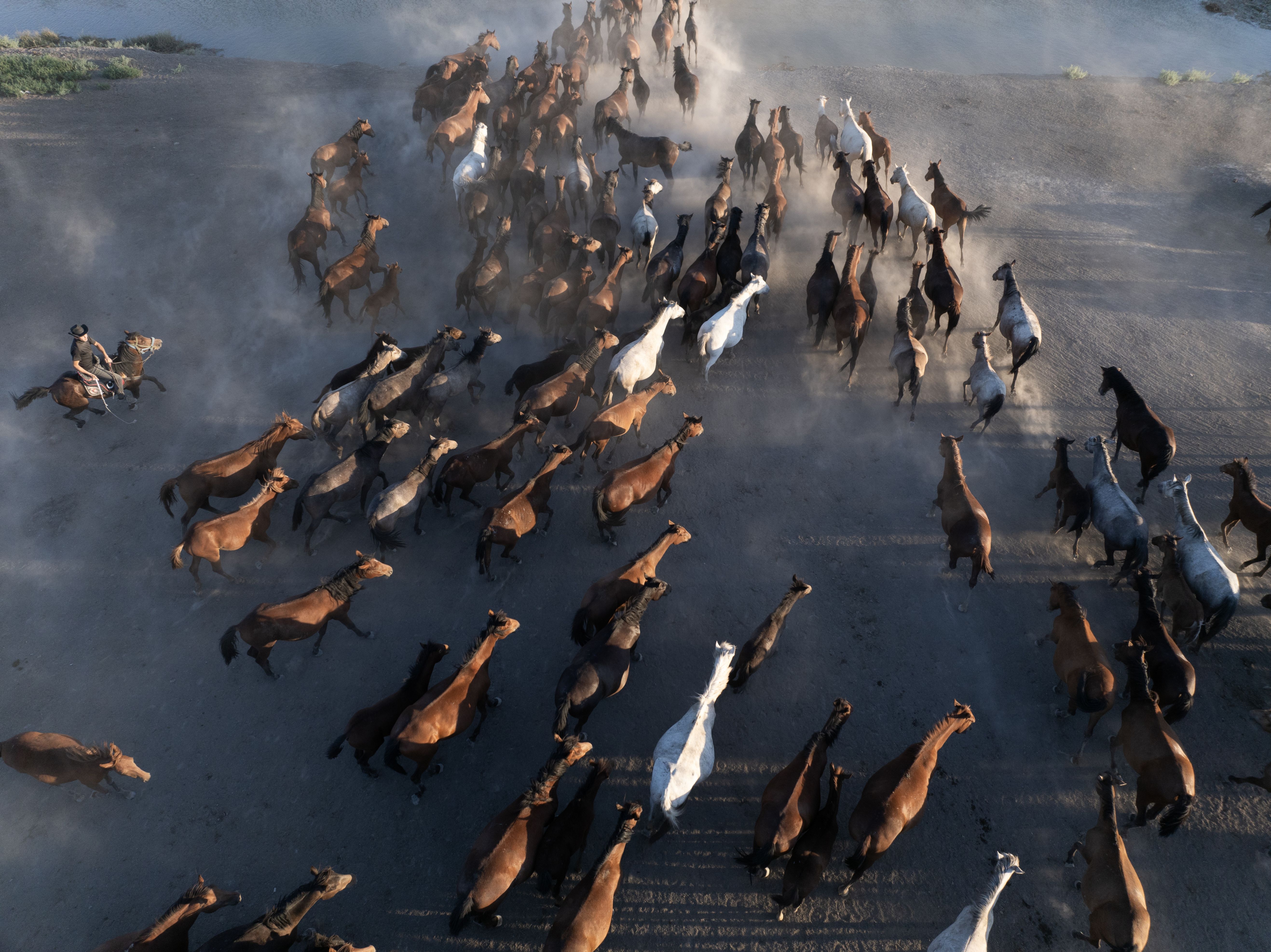 Wild horses living on the foothills of Mount Erciyes run in herds across the Hörmetçi meadows in Kayseri, Turkiye on August 26, 2024. These wild horses, seen in Hormetci, Sultan Marshes, and Soysali neighborhood, attract the attention of both nature lovers and photography enthusiasts. (Photo by Beytullah Eles/Anadolu via Getty Images)
