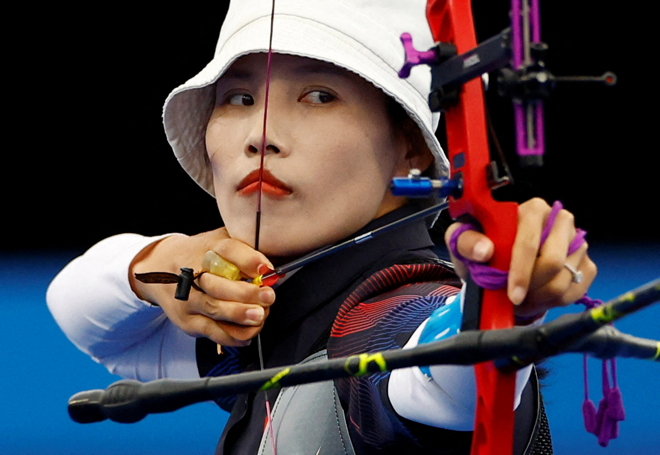 Chunyan Wu of China in action during her match against Pooja of India in women's individual recurve open in Paris, France on September 3, 2024. (Photo by Maria Abranches/Reuters)