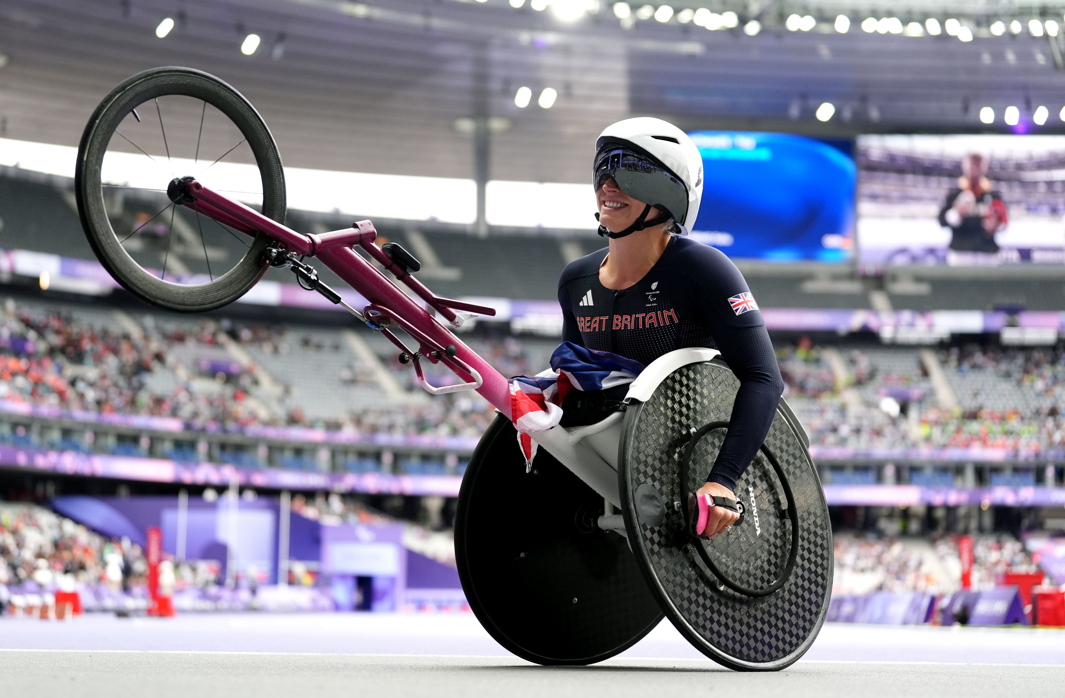 Great Britain's Samantha Kinghorn after finishing second in the Women's 1500m - T54 final at the Stade de France on day six of the Paris 2024 Summer Paralympic Games on Tuesday, September 3, 2024. (Photo by Zac Goodwin/PA Images via Getty Images)