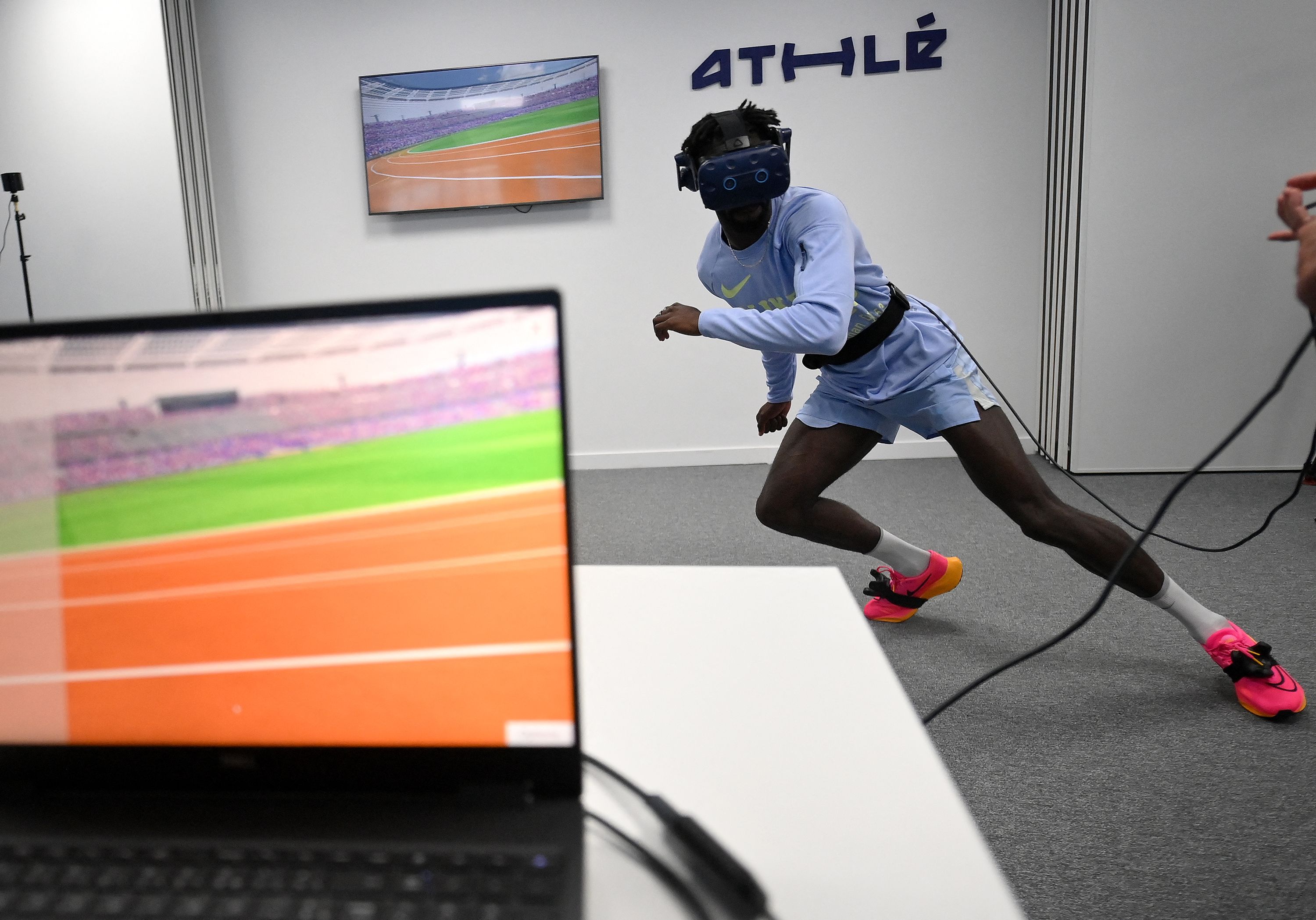 French athlete and member of the French 4x100 m relay team, Ryan Zeze, trains with a virtual reality headset in Paris, on June 1, 2023. “Leave nothing to chance”. In their quest for a medal at the Paris-2024 Olympic Games, the 4x100 m relay runners on the French athletics team are also training in a virtual world, in search of the perfect handover. (Photo by Franck Fife/AFP Photo)