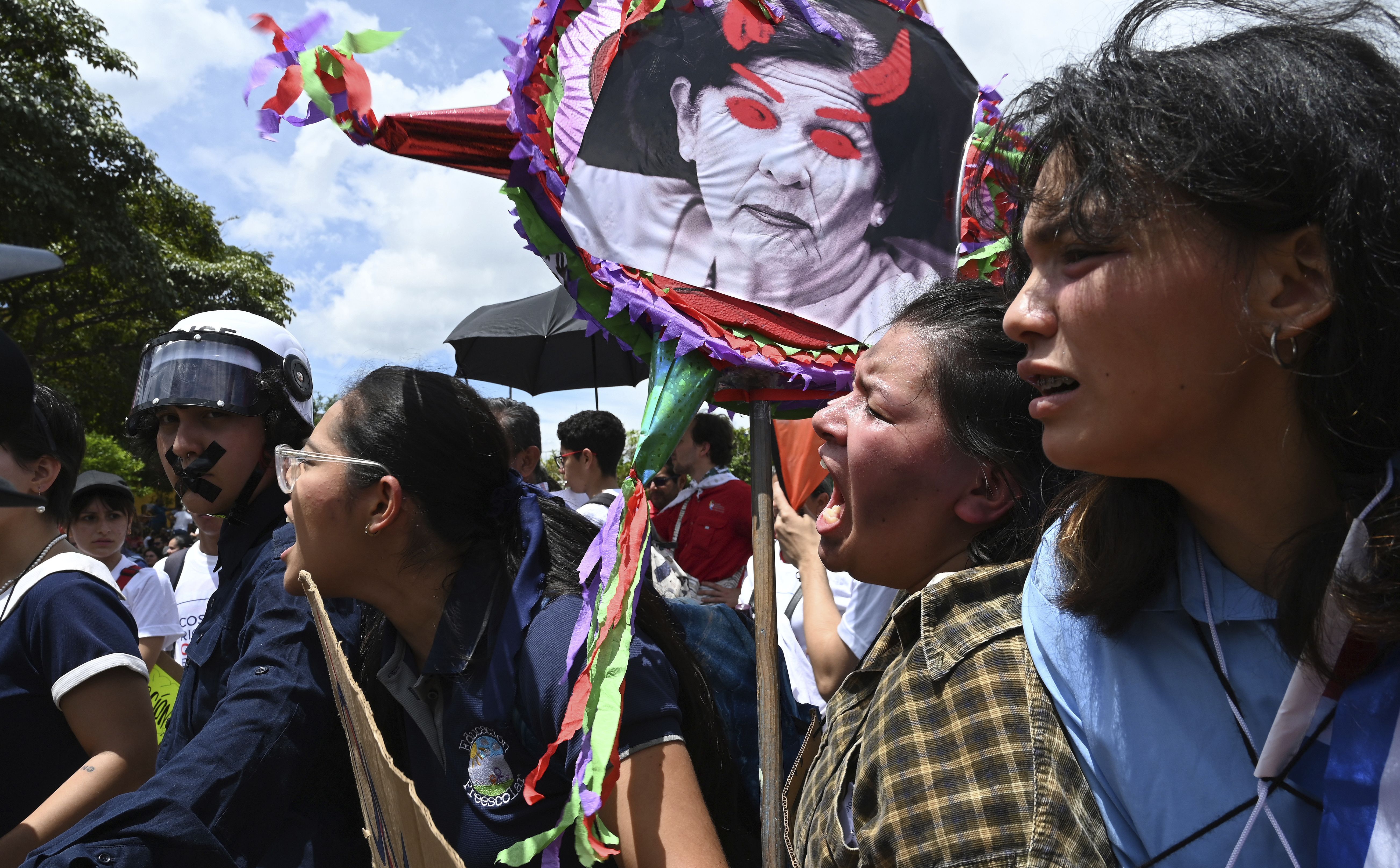 Teachers, unions and public university students march against education budget cuts put forward by Costa Rican President Rodrigo Chavez and his education minister Khatarina Müller, in San Jose, Costa Rica, Tuesday, June 20, 2023. (Photo by Carlos Gonzalez/AP Photo)