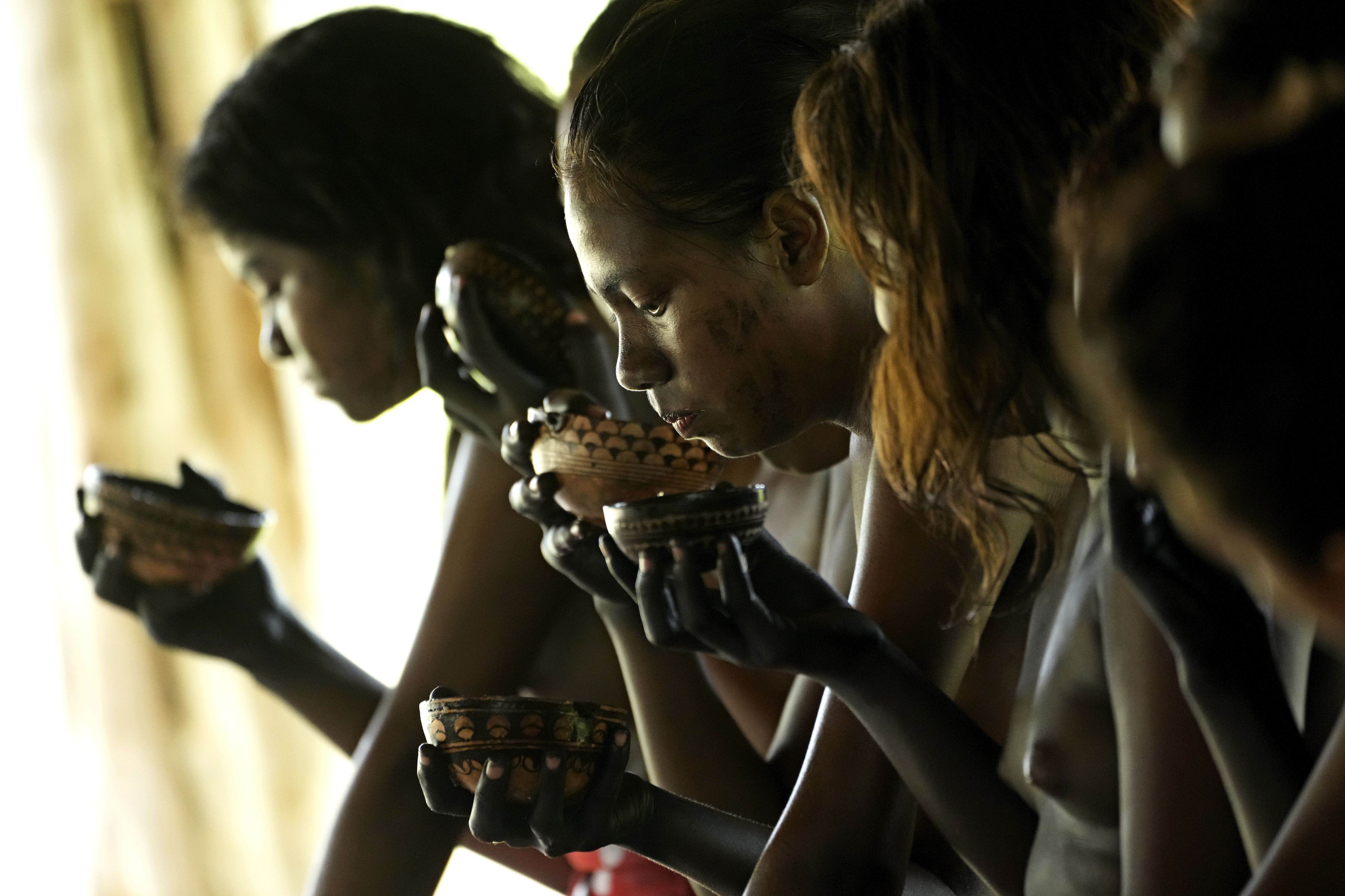 Girls drink a traditional porridge made from Cassava during the Wyra'whaw coming-of-age festival in the Ramada ritual center, in Tenetehar Wa Tembe village, located in the Alto Rio Guama Indigenous territory in Para state, Brazil, Saturday, June 10, 2023. Known as the Menina Moca in Portuguese, the three-day festival is for adolescent boys and girls in Brazil's Amazon. (Photo by Eraldo Peres/AP Photo)