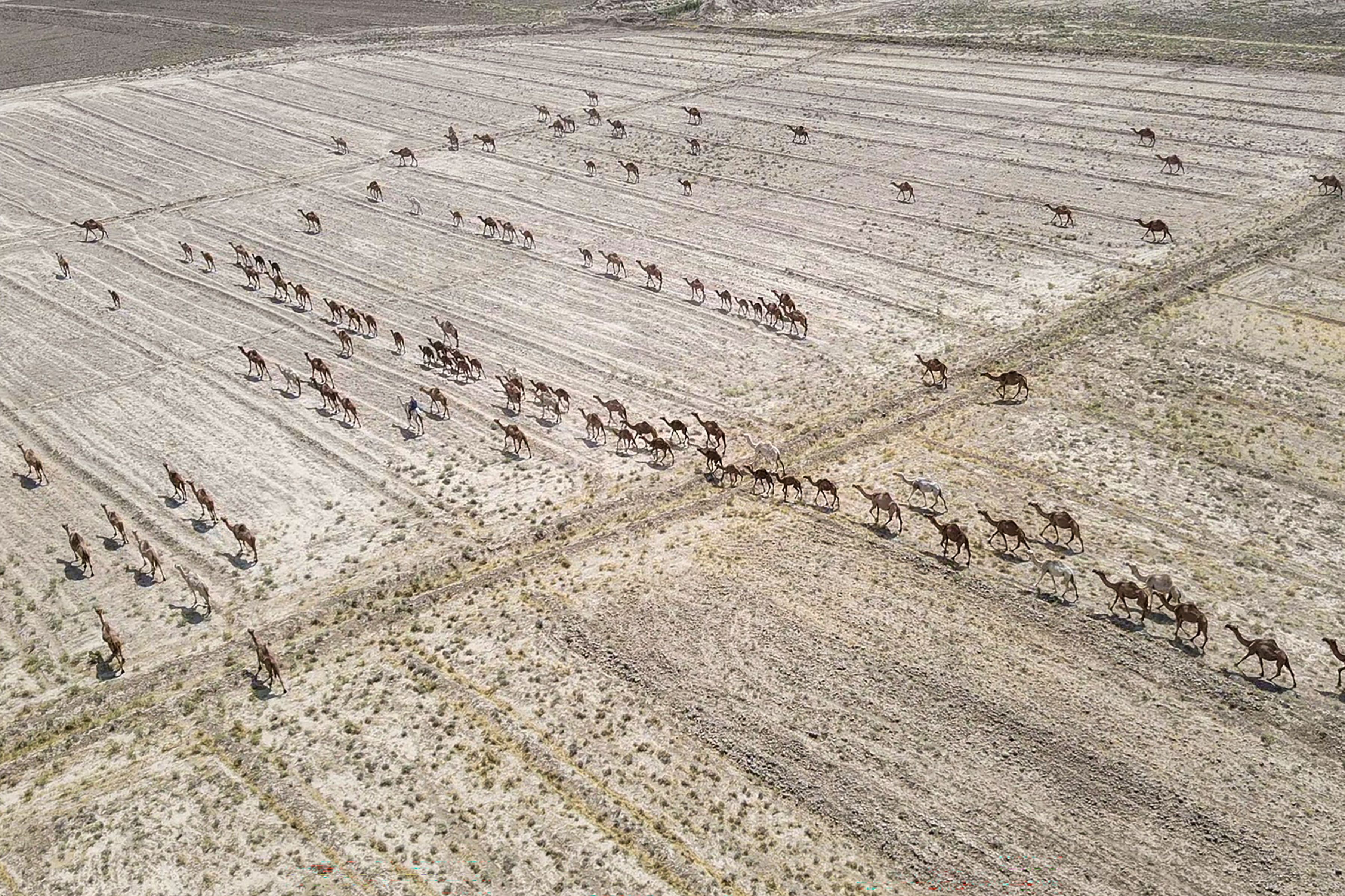 This aerial view shows a flock of camels grazing in the Khamisiyah area southeast of Baghdad, on July 9, 2024. (Photo by Karrar Jabbar/AFP Photo)