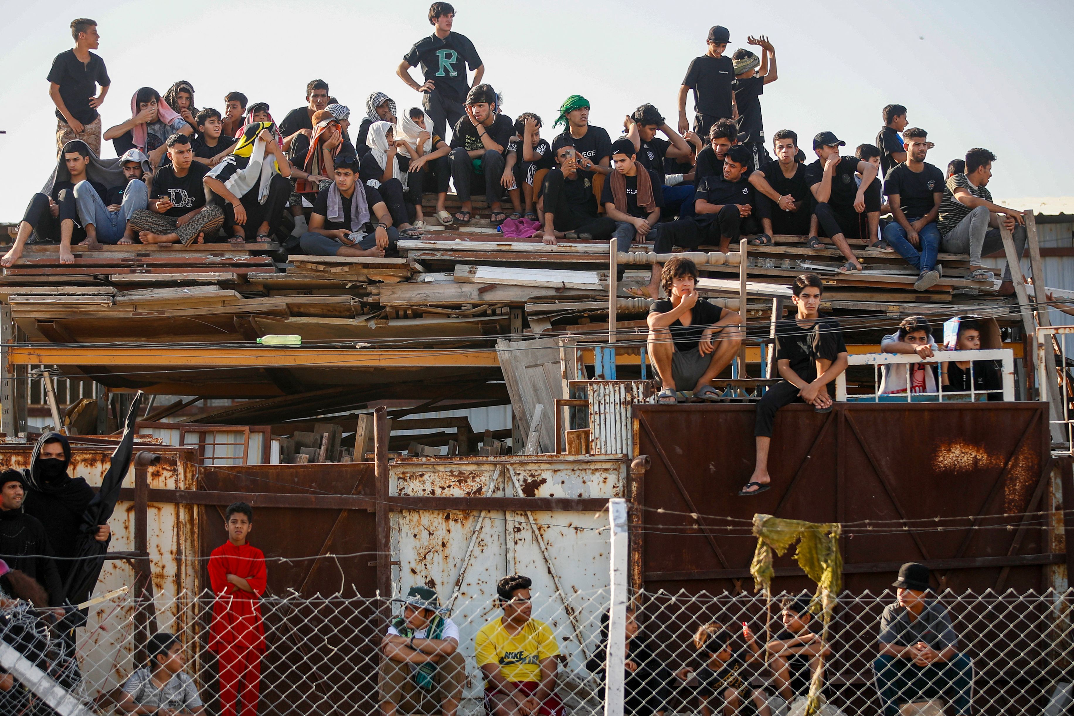 People watch as Shiite Muslims re-enact the Battle of Karbala as they mark the peak of Ashura, a 10-day period commemorating the seventh century killing of Prophet Mohammed's grandson Imam Hussein, in Sadr City in eastern Baghdad, on July 17, 2024. (Photo by Ahmad Al-Rubaye/AFP Photo)