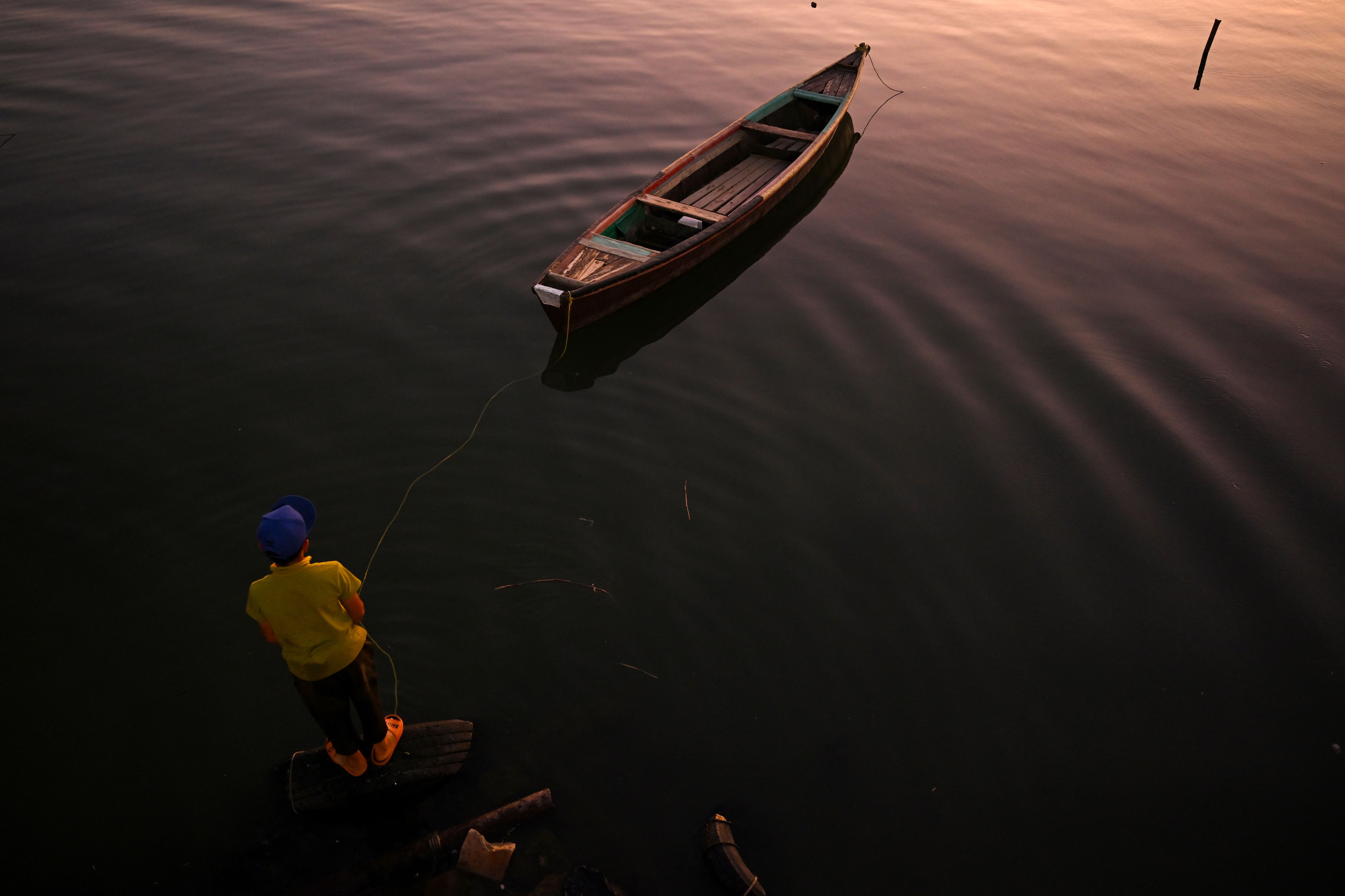 An Iraqi fisherman ties his boat to a wooden plank in the Shatt al-Arab river, formed at the confluence of the Tigris and Euphrates rivers, in Iraq's southern city of Basra, on August 12, 2024. (Photo by Hussein Faleh/AFP Photo)
