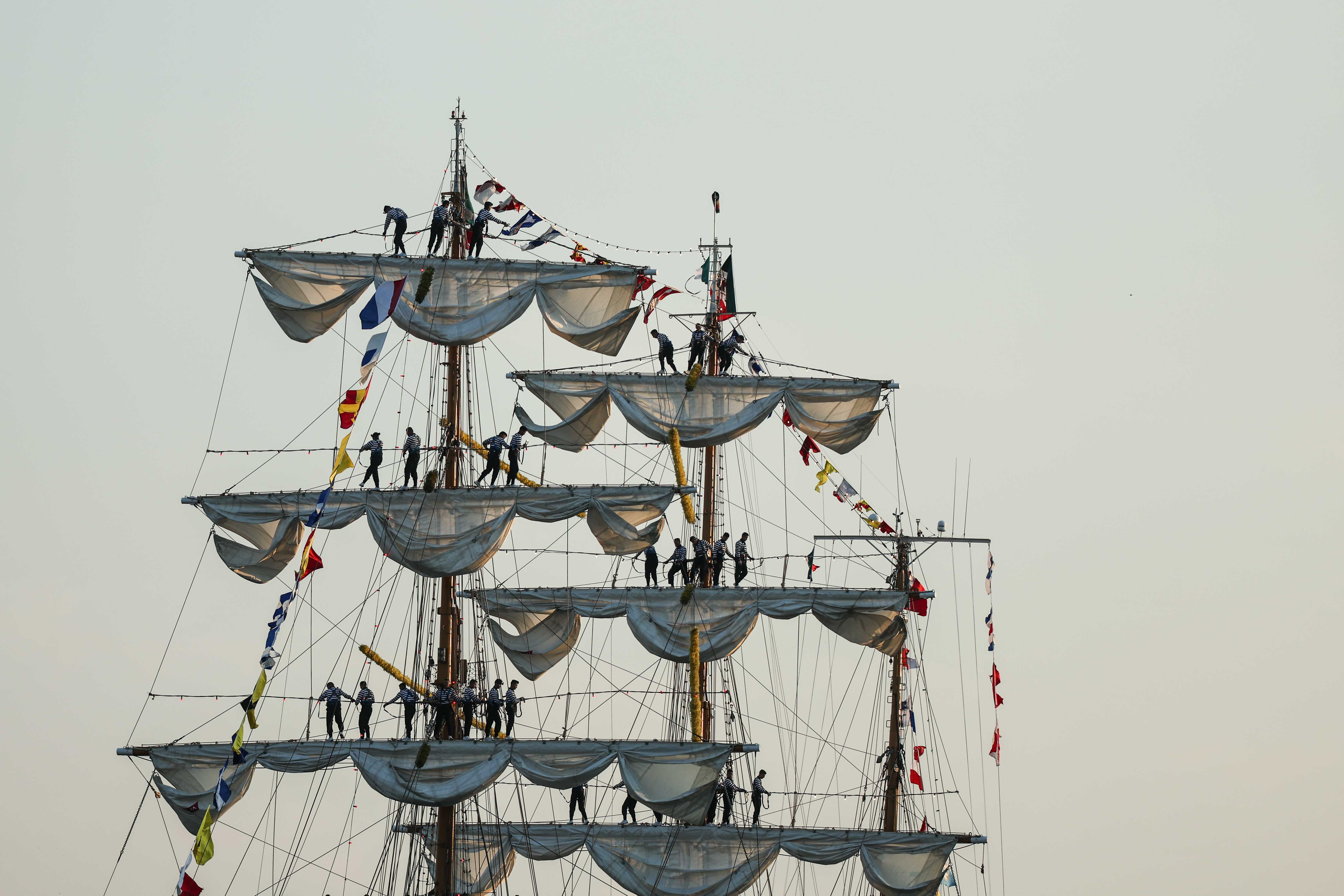 Sailors perform on the three-masted sailboat “Cuauhtemoc” flying the Mexican flag, in the Seine river during Armada 2023, in Rouen, France, 08 June 2023. Armada 2023 is the 8th edition of an event which gathers the most beautiful vessels in the world in the quays of Rouen. (Photo by Mohammed Badra/EPA)
