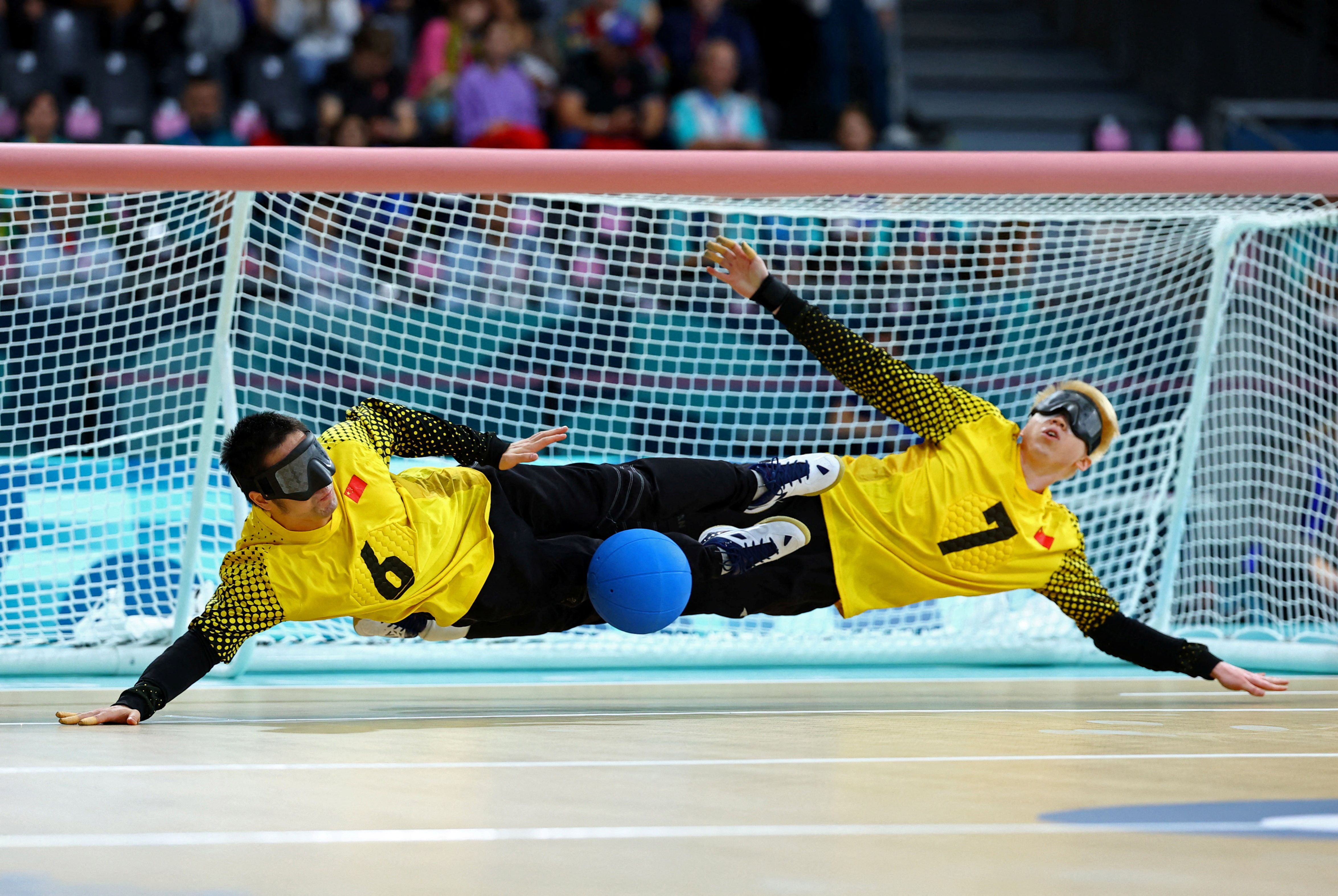 Yu Qinquan and Yu Deyi of China in action against Brazil during their men's bronze medal goalball match at the Paris Paralympics on September 5, 2024. (Photo by Kacper Pempel/Reuters)