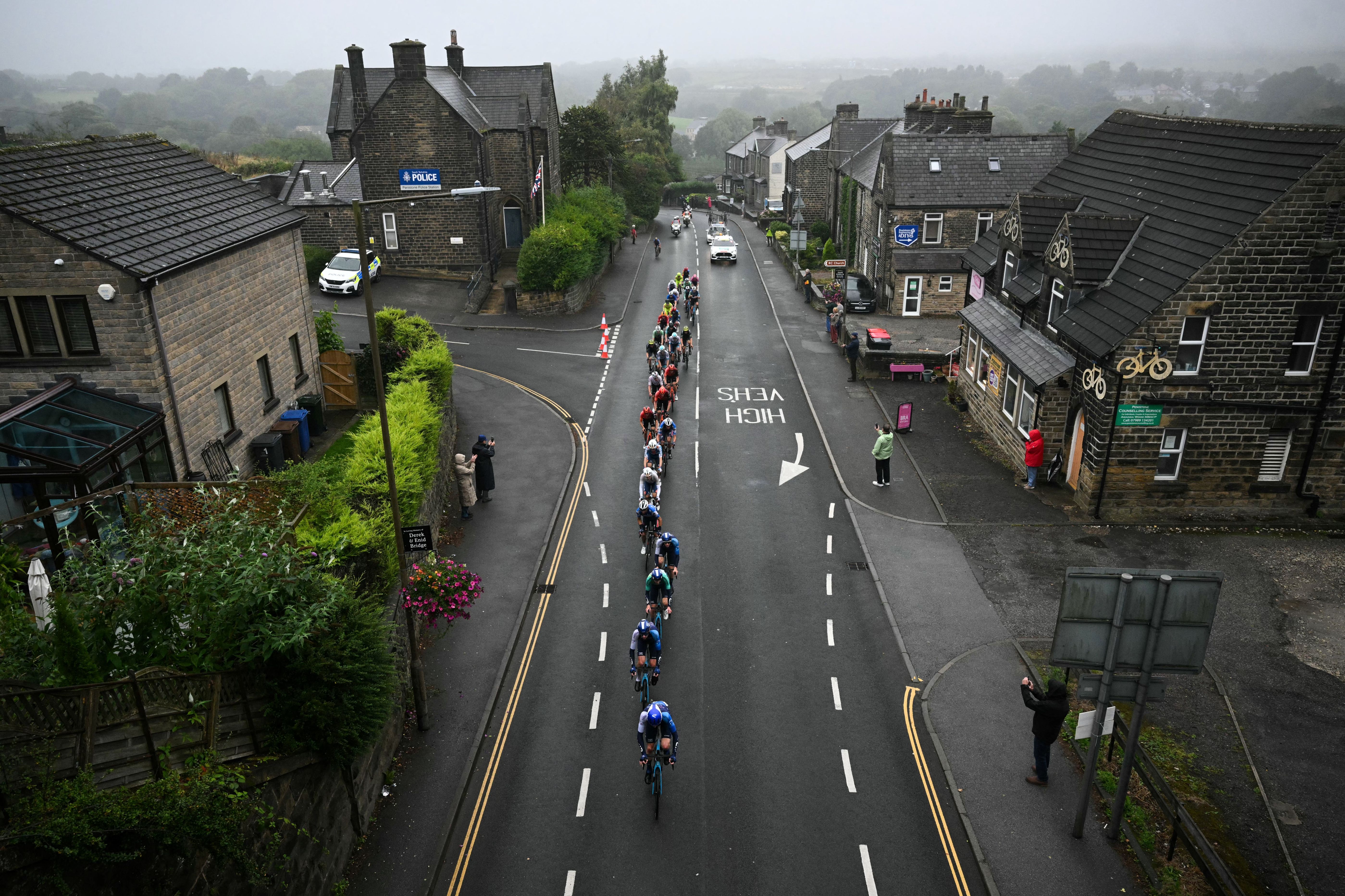 The peloton cycles through Penistone, northern England, during the third stage from Sheffield to Barnsley of the Tour of Britain cycling race, on September 5, 2024. (Photo by Oli Scarff/AFP Photo)