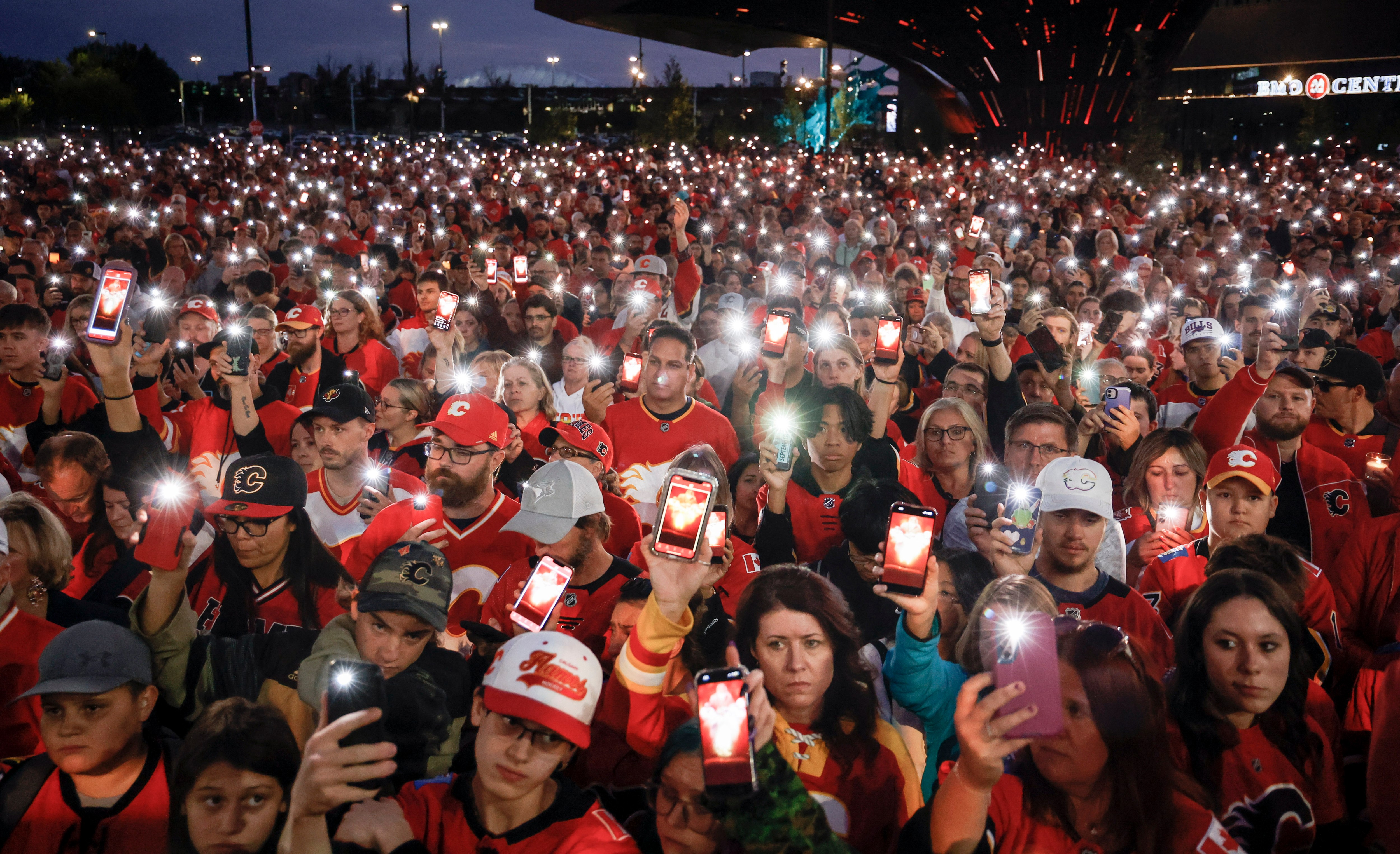 The American ice hockey players Johnny and Matthew Gaudreau died last Thursday when they were struck by a car while riding bicycles near their home in New Jersey. Fans remembered the brothers at a vigil in the Canadian city of Calgary on September 4, 2024. (Photo by Jeff McIntosh/The Canadian Press/AP Photo)