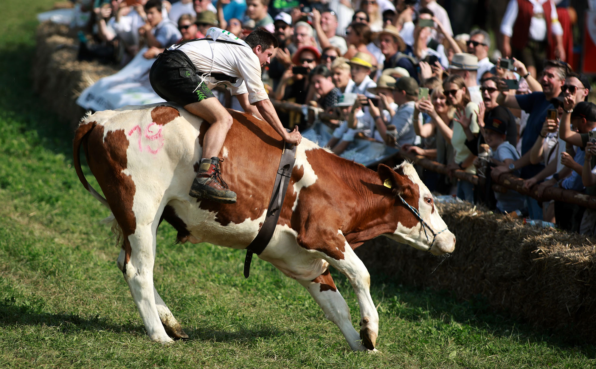 A participant wearing traditional Bavarian lederhosen races to the finish on his ox in the 2024 Muensing Oxen Race (Muensinger Ochsenrennen) on September 01, 2024 in Muensing, Germany. The event, which pits the pride and glory of local ox breeders against one another, takes place only once every four years. The 2020 race was cancelled due to the coronavirus pandemic. (Photo by Johannes Simon/Getty Images)