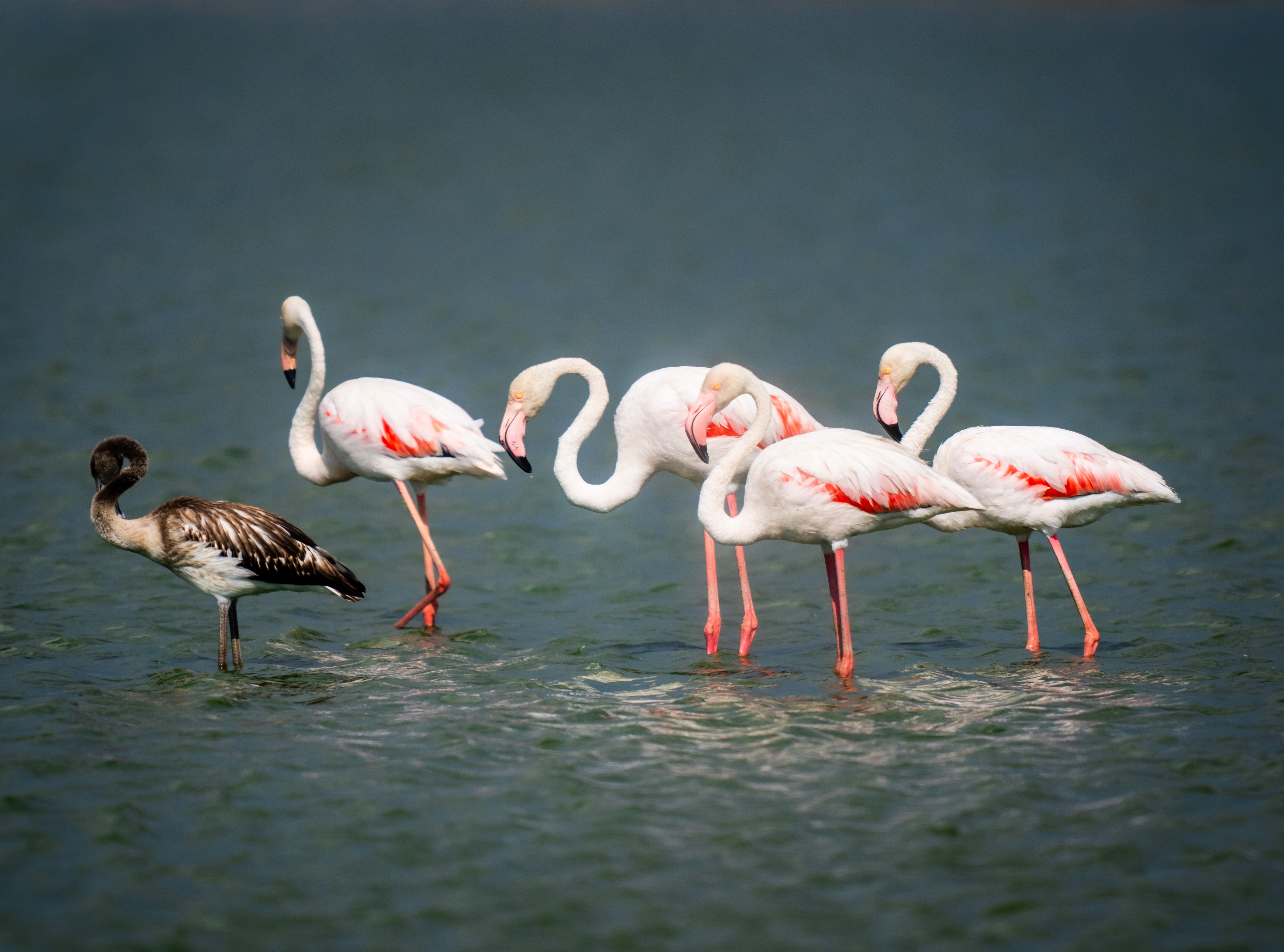 Flamingos, migrating to warmer regions in the fall, are seen in the lake in Ankara, Turkiye on August 28, 2024. Flamingo chicks were born by breaking their eggs in the spring months in Lake Tuz, Duden Lake and various lakes and ponds of Ankara, which host flamingo colonies in Turkiye. The hatchlings of the flamingos have reached the maturity to fly for migration after receiving flying lessons from their parents. (Photo by Emin Sansar/Anadolu via Getty Images)