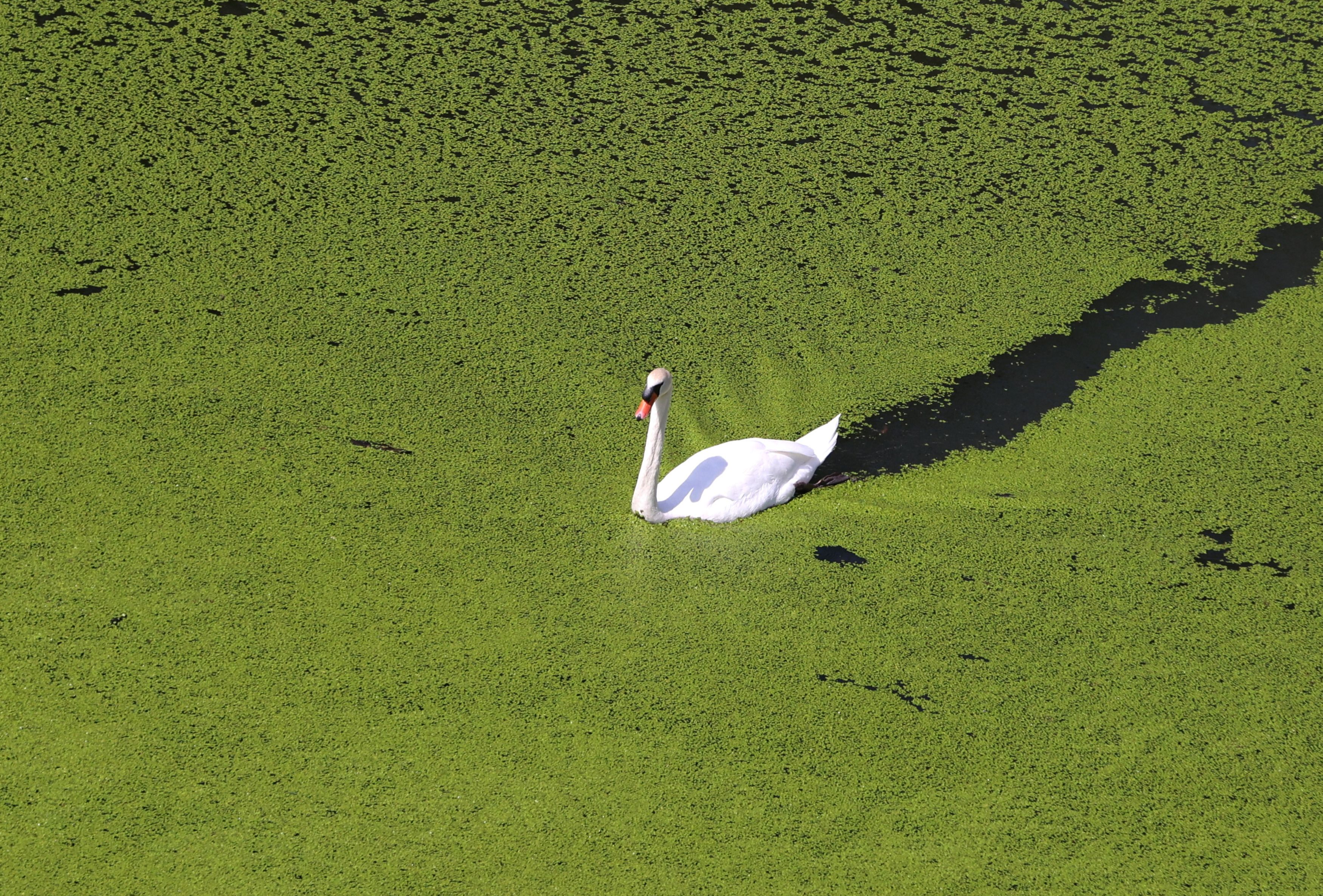 A swan swims in the Sava river's Cukaricki meander covered in algae in Belgrade, Serbia, 02 September 2024. The Cukaricki meander's waters are a mix of backwaters, river water, and wastewater, which, combined with poor circulation and high temperatures, have turned the area into a settling basin for pollutants. This has led to the overgrowth of algae, creating a “green carpet” effect, which is common in rivers during hot, dry summers due to increased nutrient levels and reduced oxygen. (Photo by Andrej Cukic/EPA/EFE)