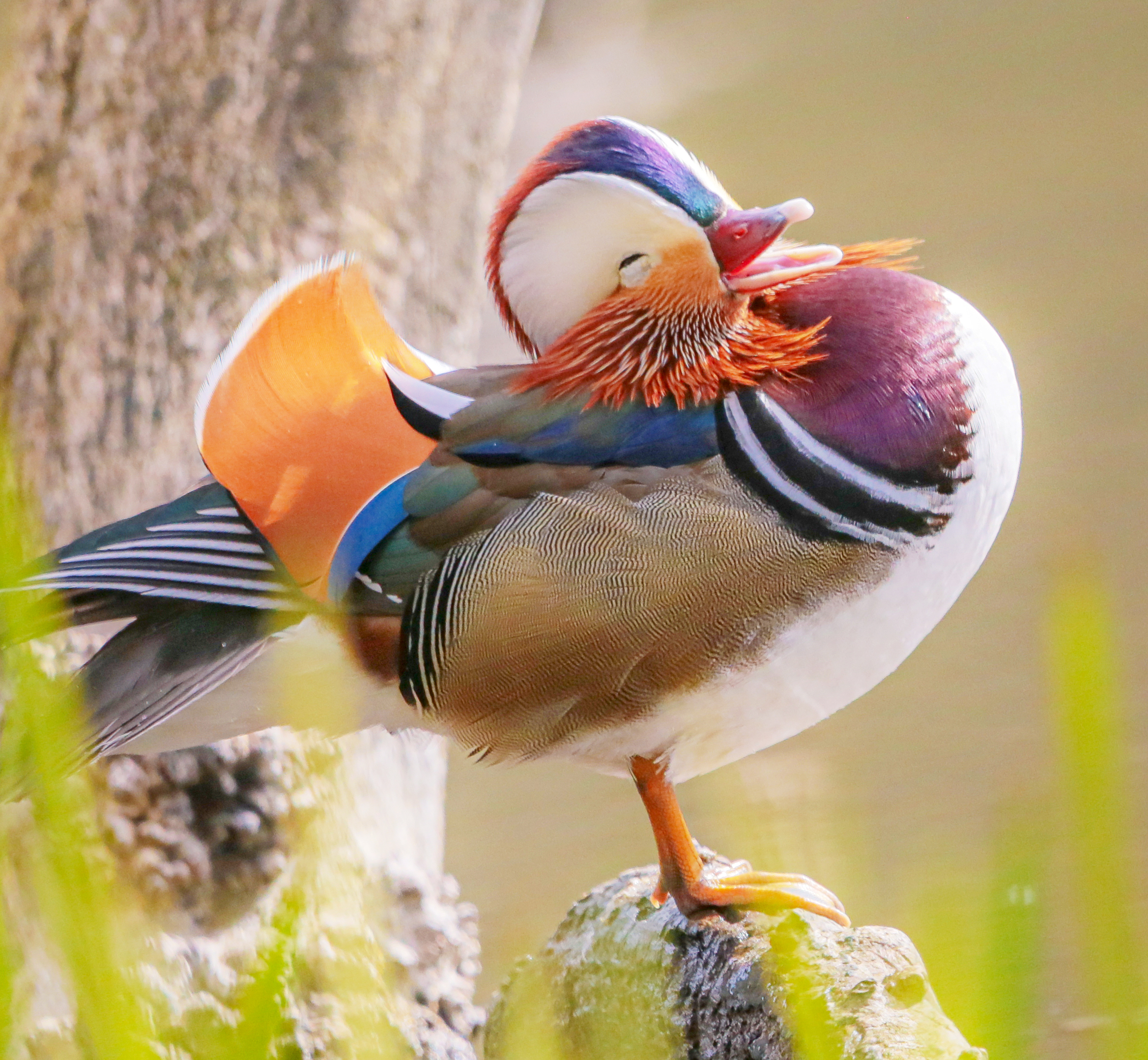 A male mandarin duck – a species introduced from east Asia – appears to quack up with laughter while preening his feathers at Fyvie Loch in Aberdeenshire, Scotland early September 2024. (Photo by Mark Deans/SplitPics UK)