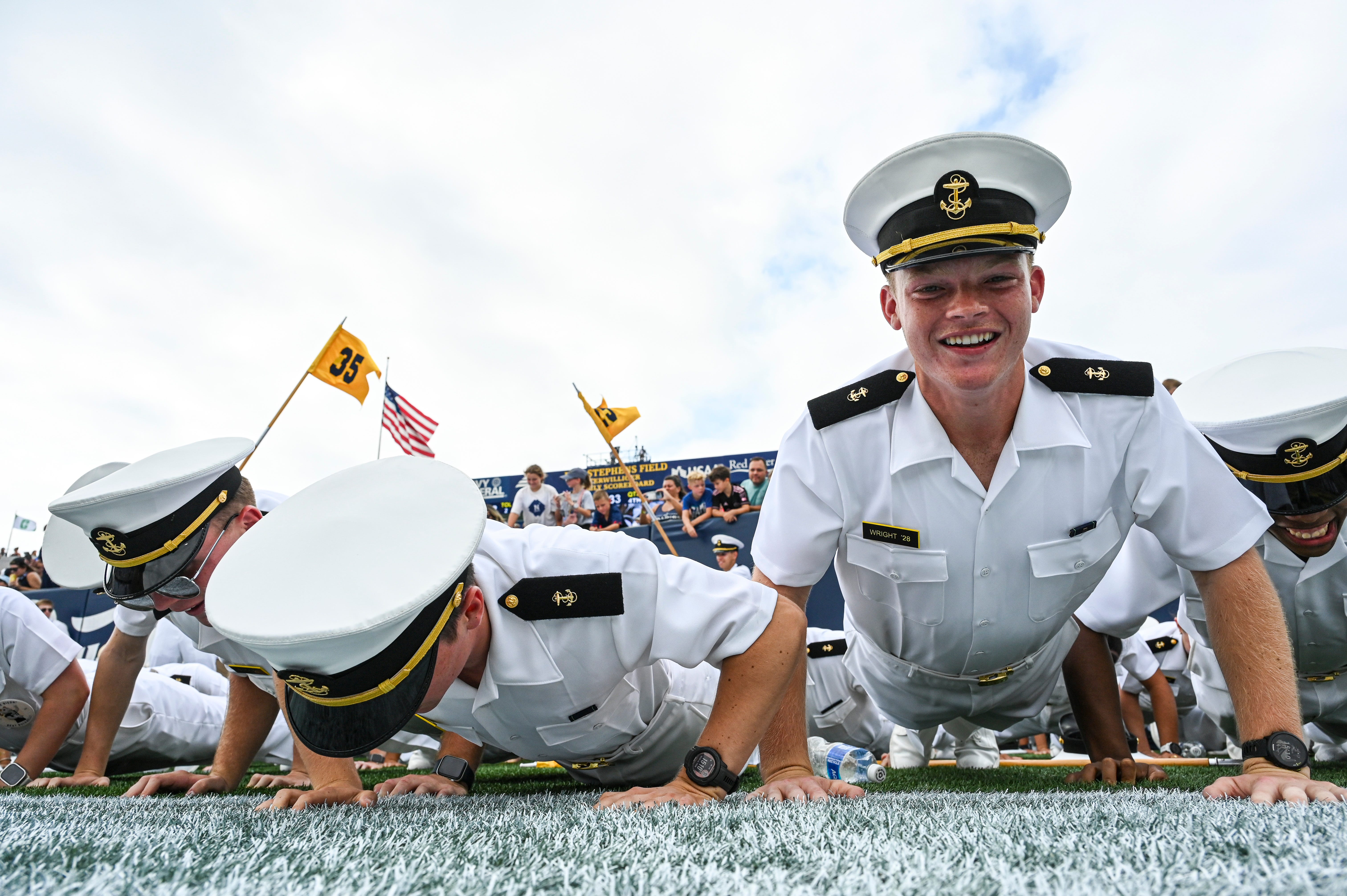 Navy Midshipmen do push ups after fourth quarter touchdown against the Bucknell Bison at Navy-Marine Corps Memorial Stadium in Annapolis, Maryland on August 31, 2024. (Photo by Tommy Gilligan/USA TODAY Sports)