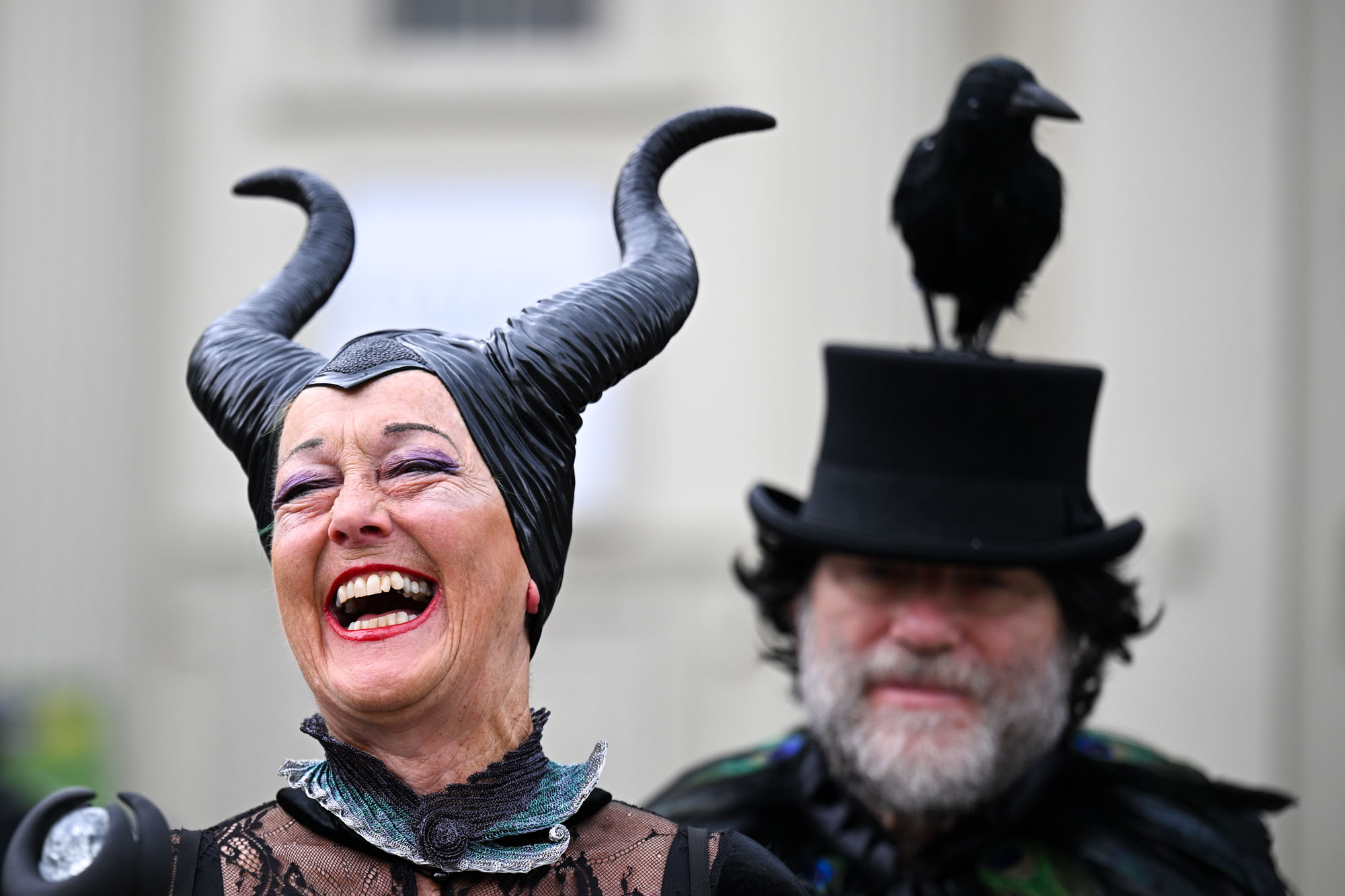 People wearing a Maleficent and crow creative hats enjoy the Bridport Hat Festival at Bucky Doo Square, on September 07, 2024 in Bridport, England. Bridport's quirky Hat Festival features hundreds of participants dressed in elegant, creative, technically ingenious and often bizarre creations. Along with various “Best Hatted” competitions, there is “Hat Hurling” and “Best Hatted Dog” raising money for head-related charities. (Photo by Finnbarr Webster/Getty Images)