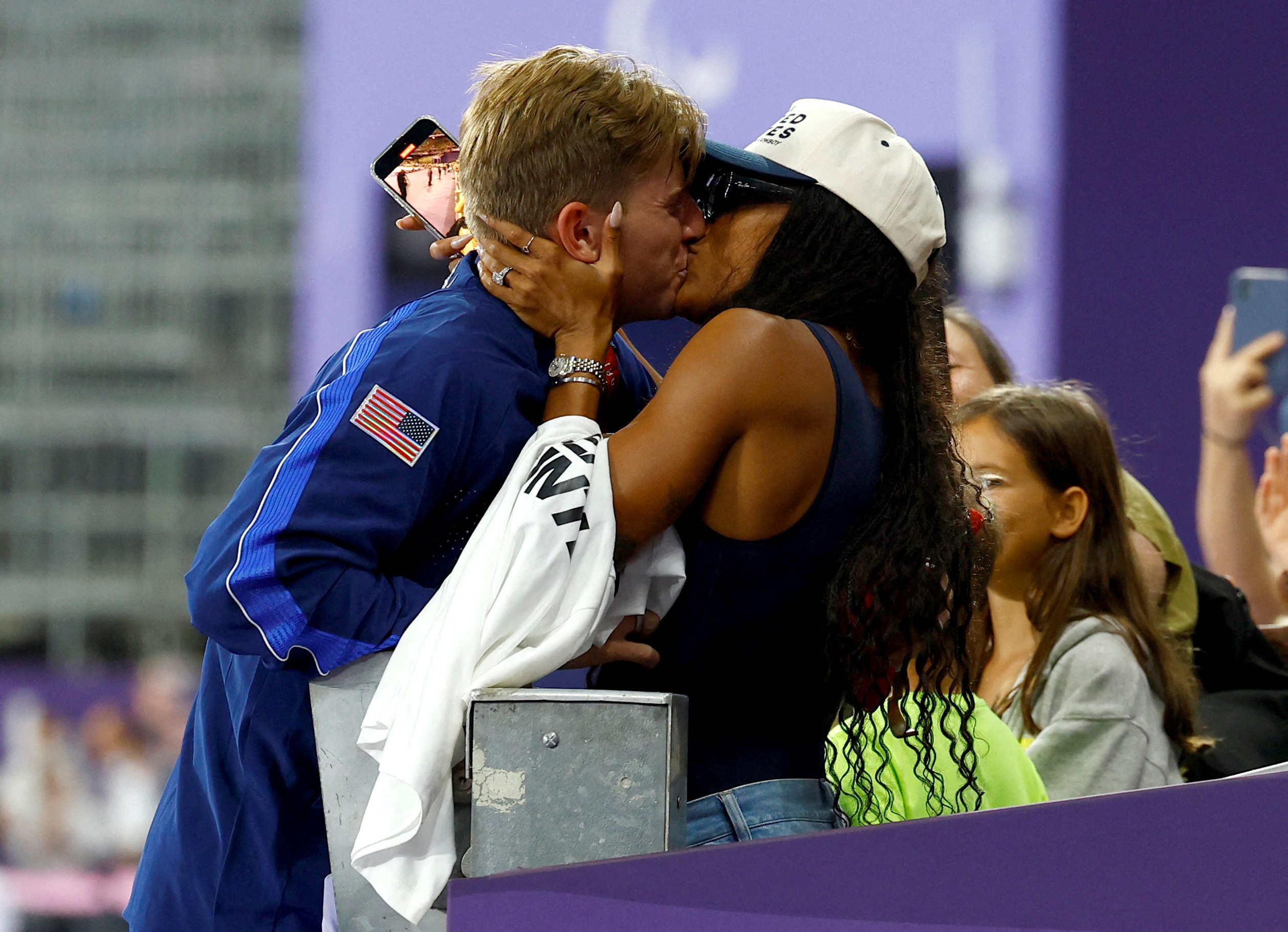 Gold medalist Fleur Jong of the Netherlands celebrates with his partner, gold medalist at the 2024 Summer Olympics Tara Davis-Woodall at the men's 400m T62 medal ceremony on September 6, 2024. (Photo by Thomas Mukoya/Reuters)