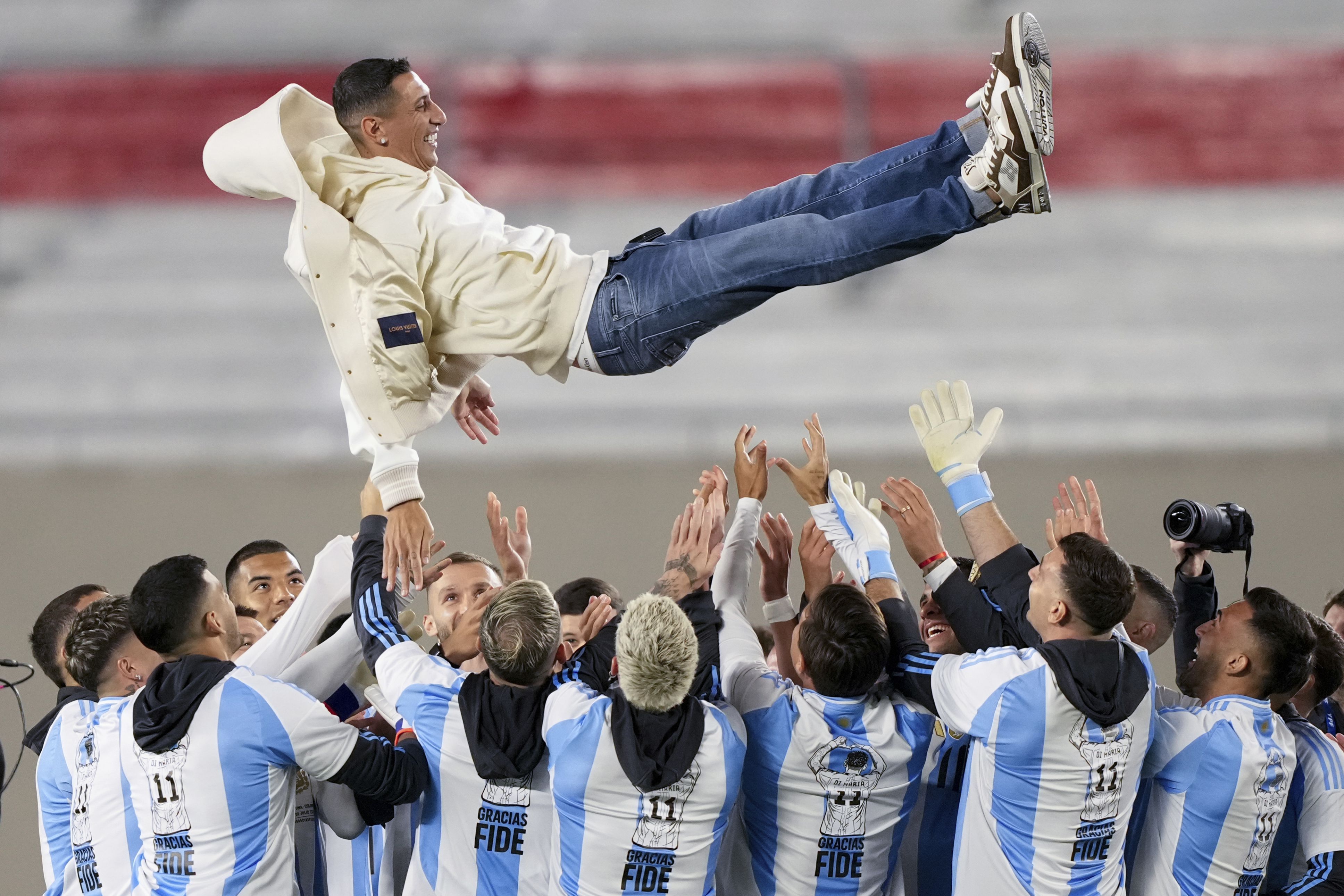 Players of Argentina hoist Ángel Di María before a qualifying soccer match for the FIFA World Cup 2026 against Chile in Buenos Aires, Argentina, Thursday, September 5, 2024. (Photo by Natacha Pisarenko/AP Photo)