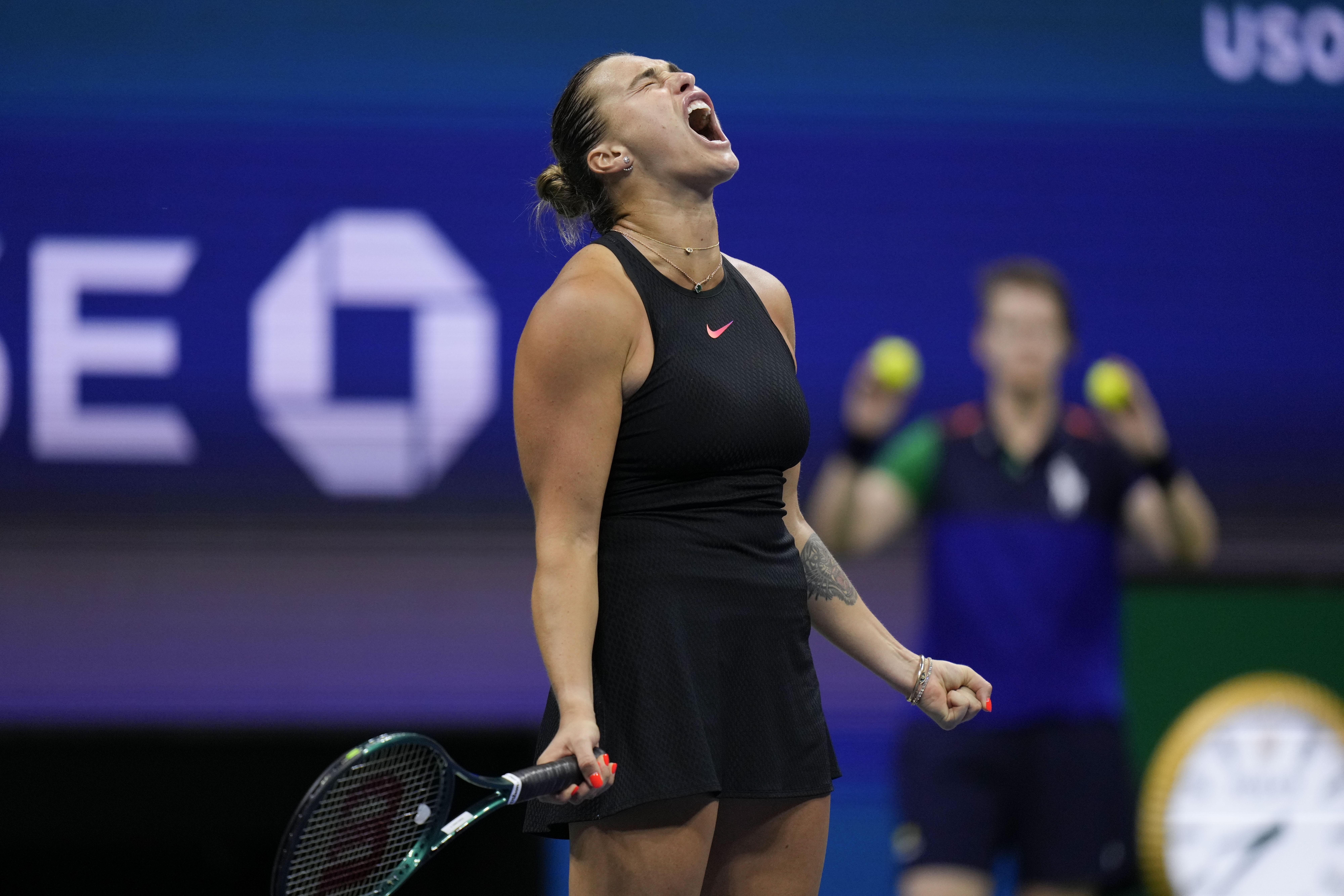 Aryna Sabalenka, of Belarus, reacts against Emma Navarro, of the United States, during the women's singles semifinals of the U.S. Open tennis championships, Thursday, September 5, 2024, in New York. (Phoot by Seth Wenig/AP Photo)