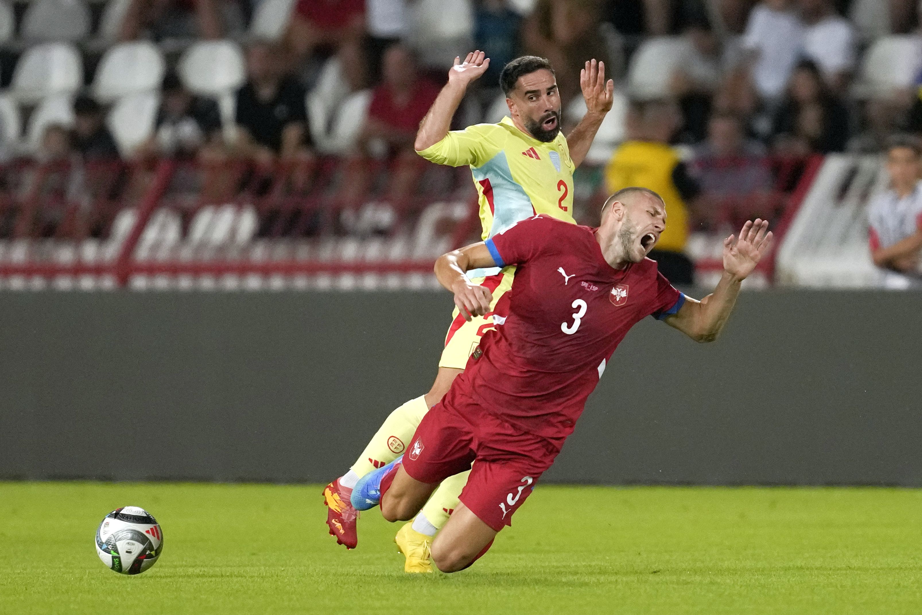 Spain's Dani Carvajal, left, fouls Serbia's Strahinja Pavlovic during the UEFA Nations League soccer match between Serbia and Spain at the Rajko Mitic Stadium, in Belgrade, Serbia, Thursday, September 5, 2024. (Photo by Darko Vojinovic/AP Photo)