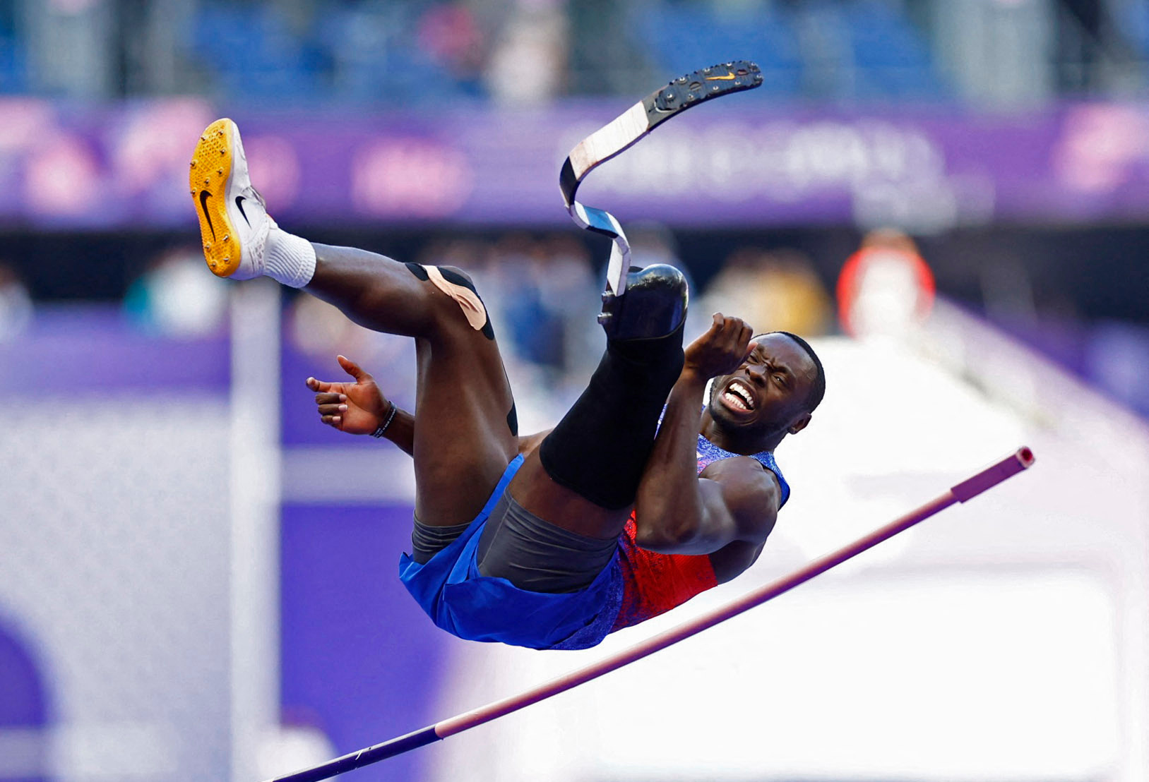 US high jumper Derek Loccident just clips the bar in the men’s T64 final on September 6, 2024. The American had to settle for silver with a best jump of 2.06m as India’s Kumar Praveen won gold. (Photo by Stéphanie Lecocq/Reuters)