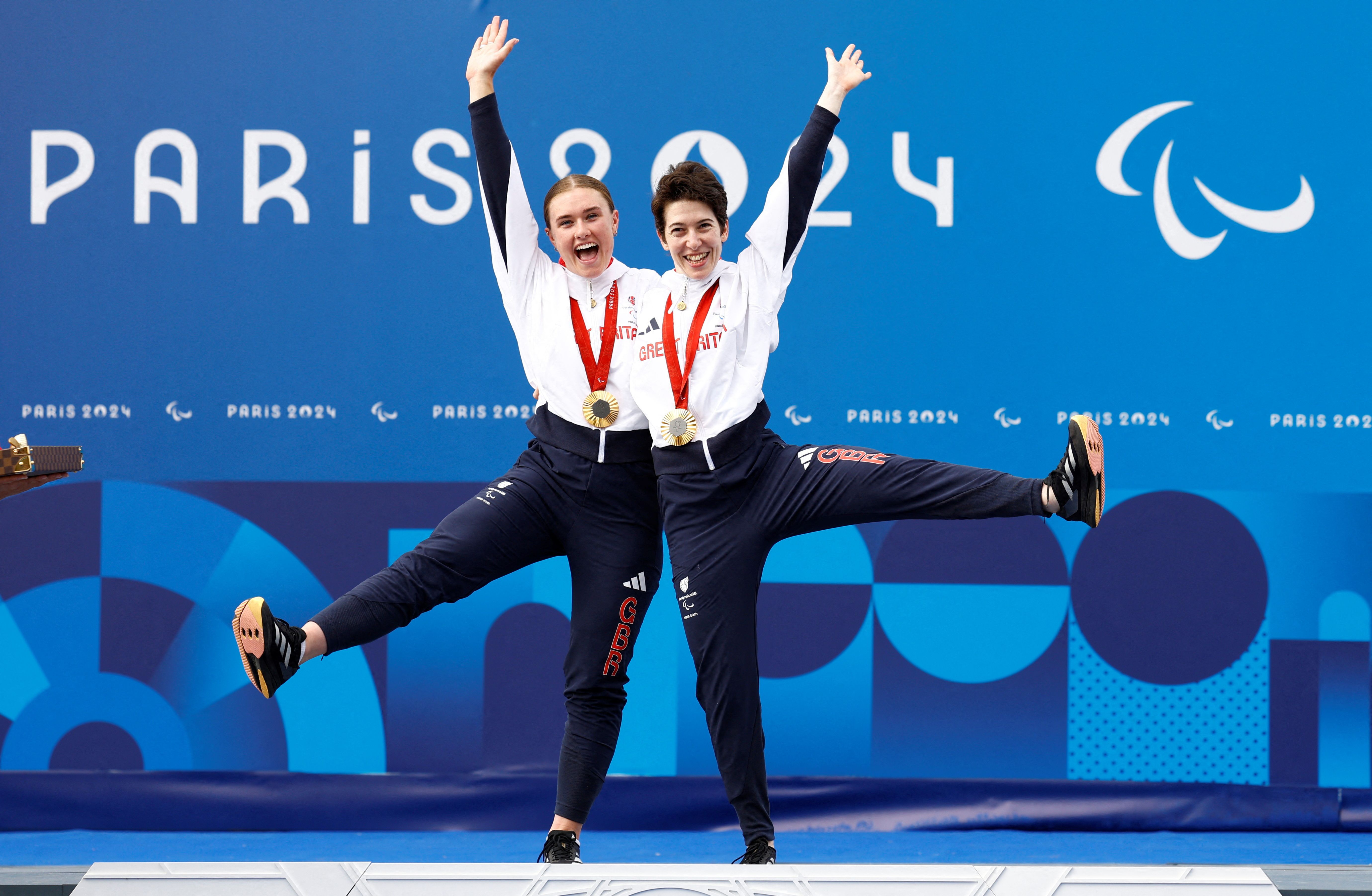 Gold medalist Sophie Unwin of Britain and pilot Jenny Holl celebrate on the podium after the women's B road race on September 6, 2024. (Photo by Maria Abranches/Reuters)