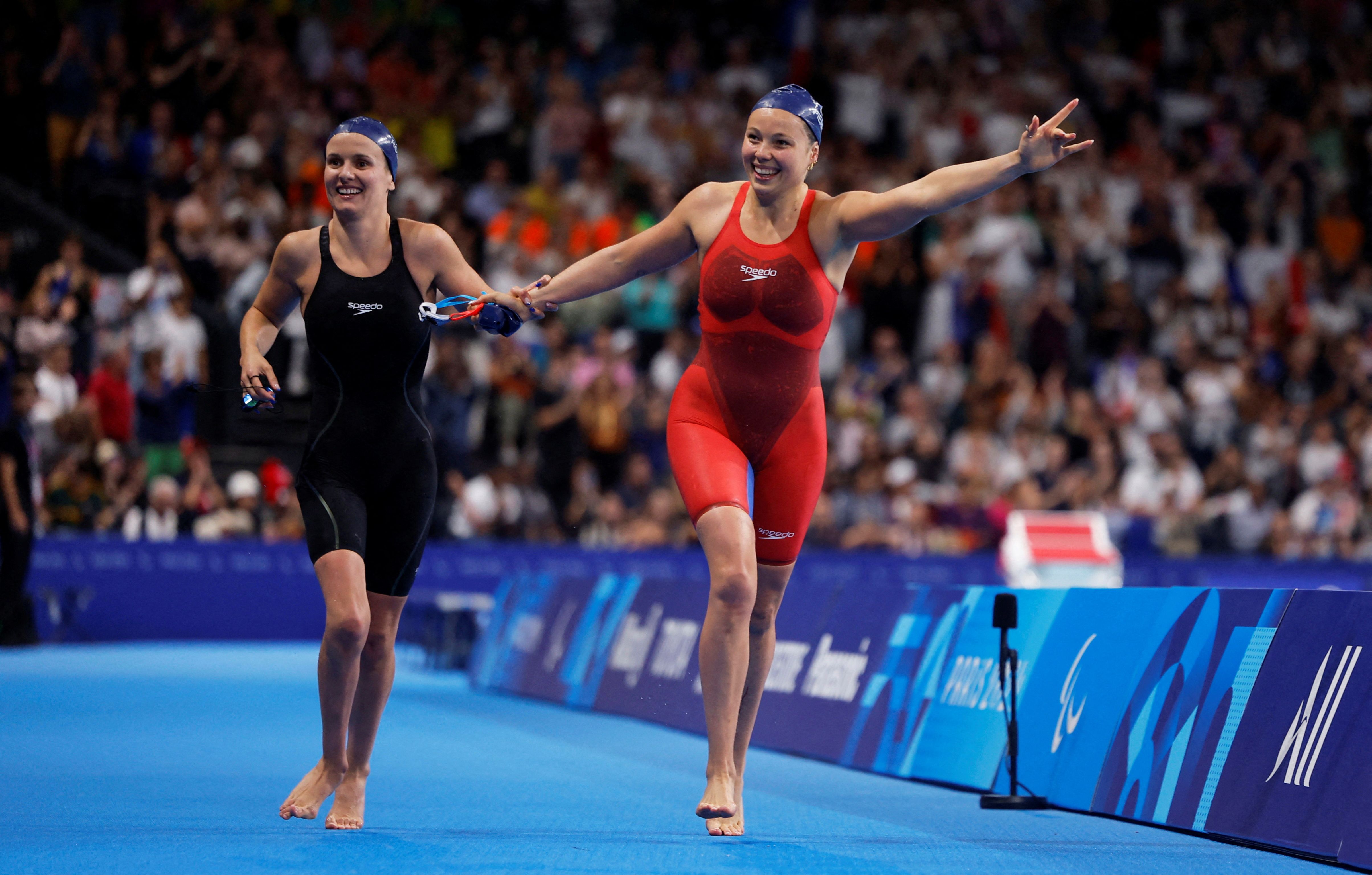 Emeline Pierre and Anaelle Roulet of France celebrate during the women's 100m backstroke on September 6, 2024. (Photo by Andrew Couldridge/Reuters)