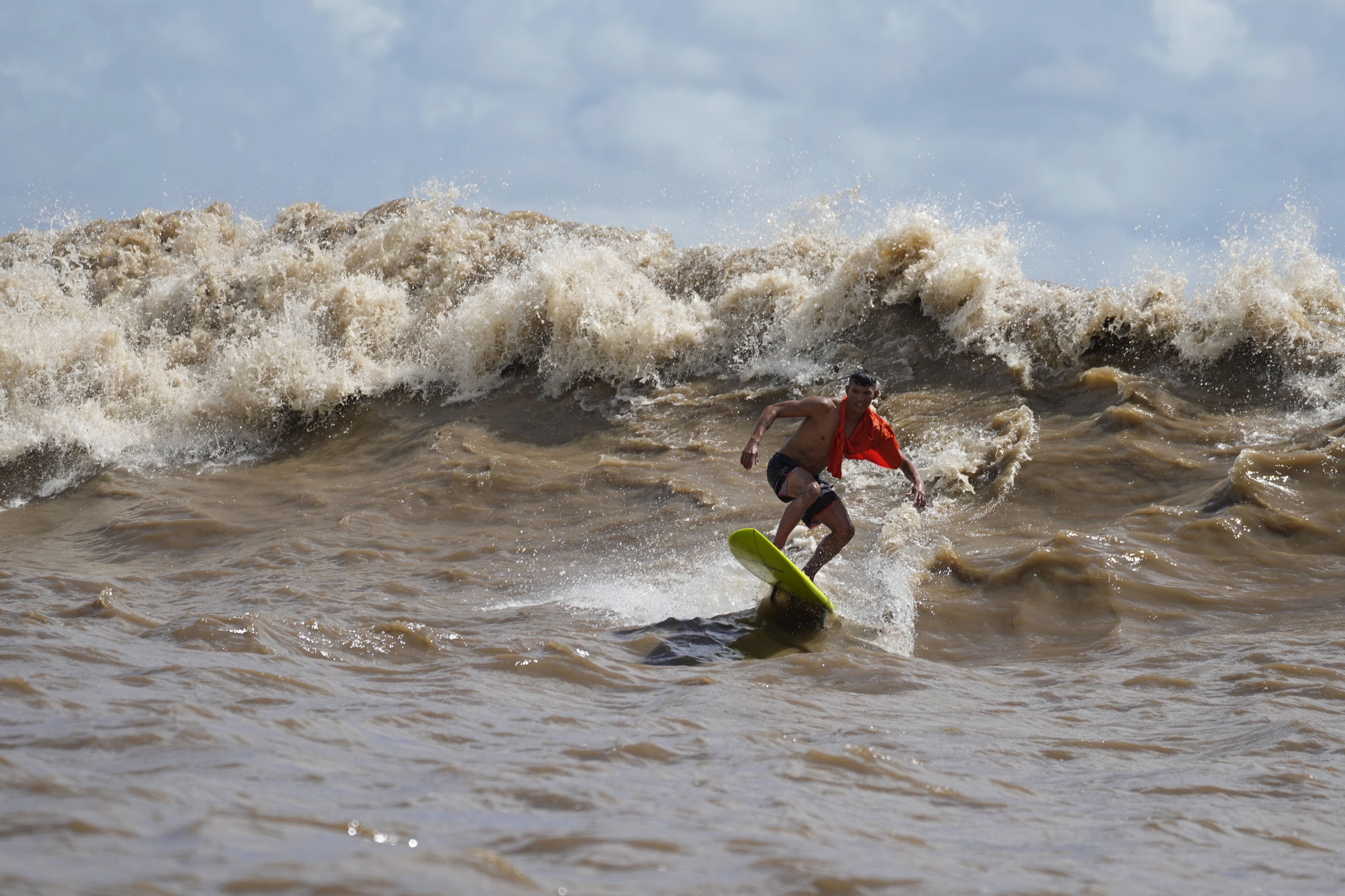 Brazilian surfer Naysson Costa rides the tidal bore wave known as “Pororoca”, during the Amazon Surf Festival held in the Canal do Perigoso, or “Dangerous Channel”, at the mouth of the Amazon River near Chaves, Marajo Island archipelago, Para state, Brazil, Monday, June 5, 2023. The Pororoca, a word from an Amazonian Indigenous dialect that means “destroyer” or “great blast”, happens twice a day when the incoming ocean tide reverses the river flow for a time. (Photo by Eraldo Peres/AP Photo)