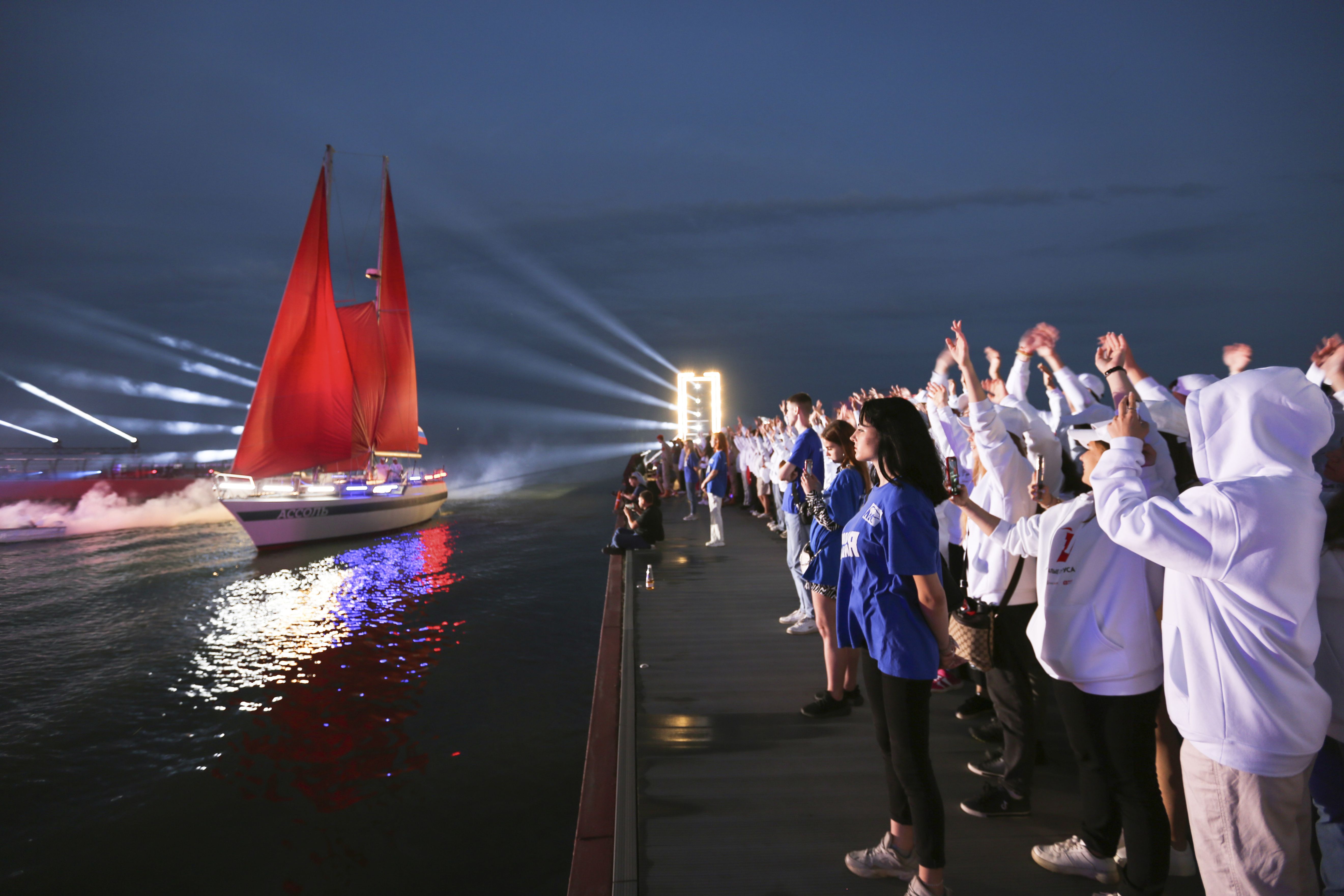 A yacht with scarlet sails floats during the Scarlet Sails festivities marking school graduation, in Mariupol, Russian-controlled Donetsk region, eastern Ukraine, Sunday, June 18, 2023. (Photo by Alexei Alexandrov/AP Photo)
