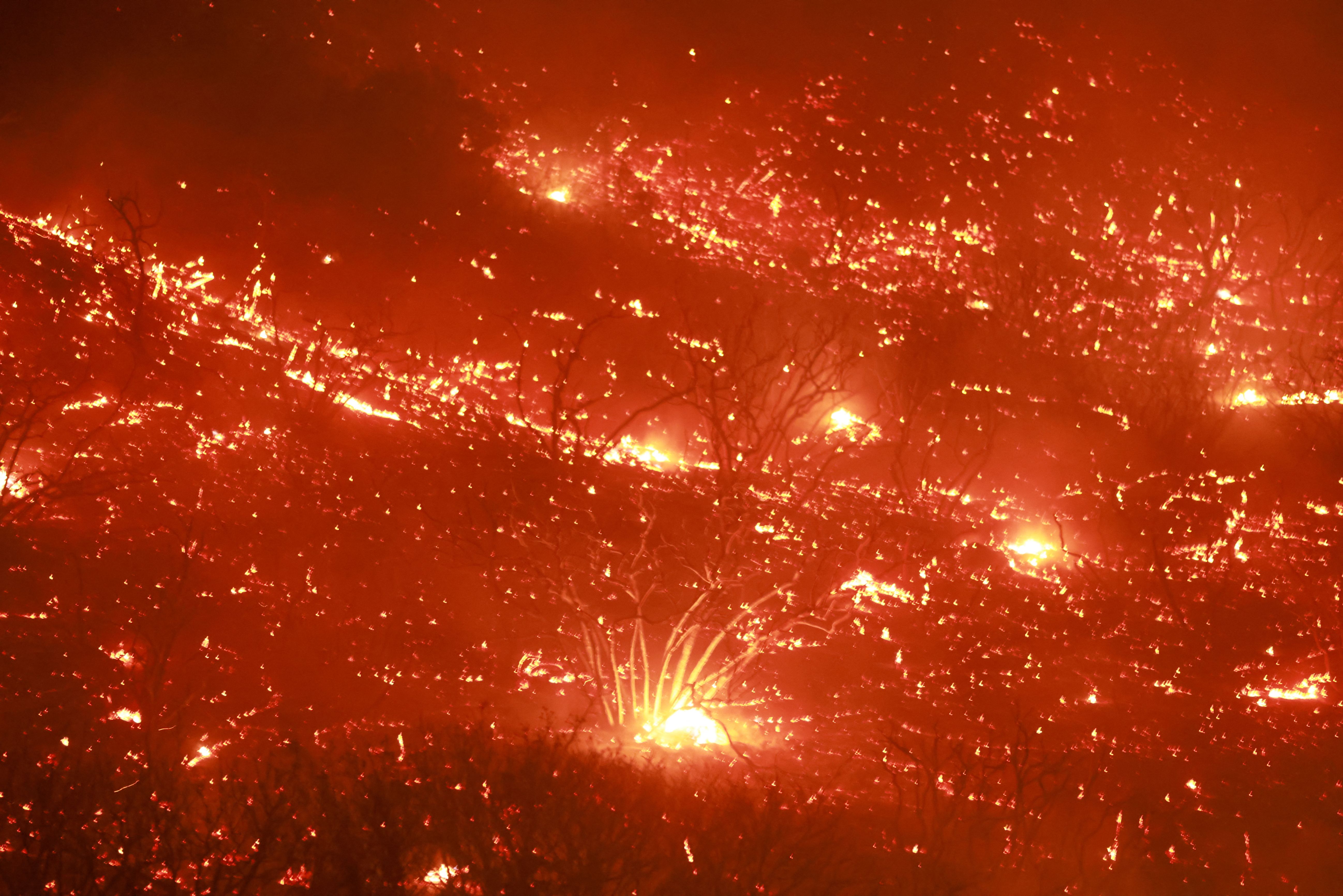 Embers fly through the air as Highway 330 is engulfed in flames from the Line Fire near Running Springs, California, on September 7, 2024. California Governor Gavin Newsom and San Bernardino County authorities declared a state of emergency on September 8. The Line Fire has burned more than 7,000 acres (2,800 hectares). (Photo by David Swanson/AFP Photo)