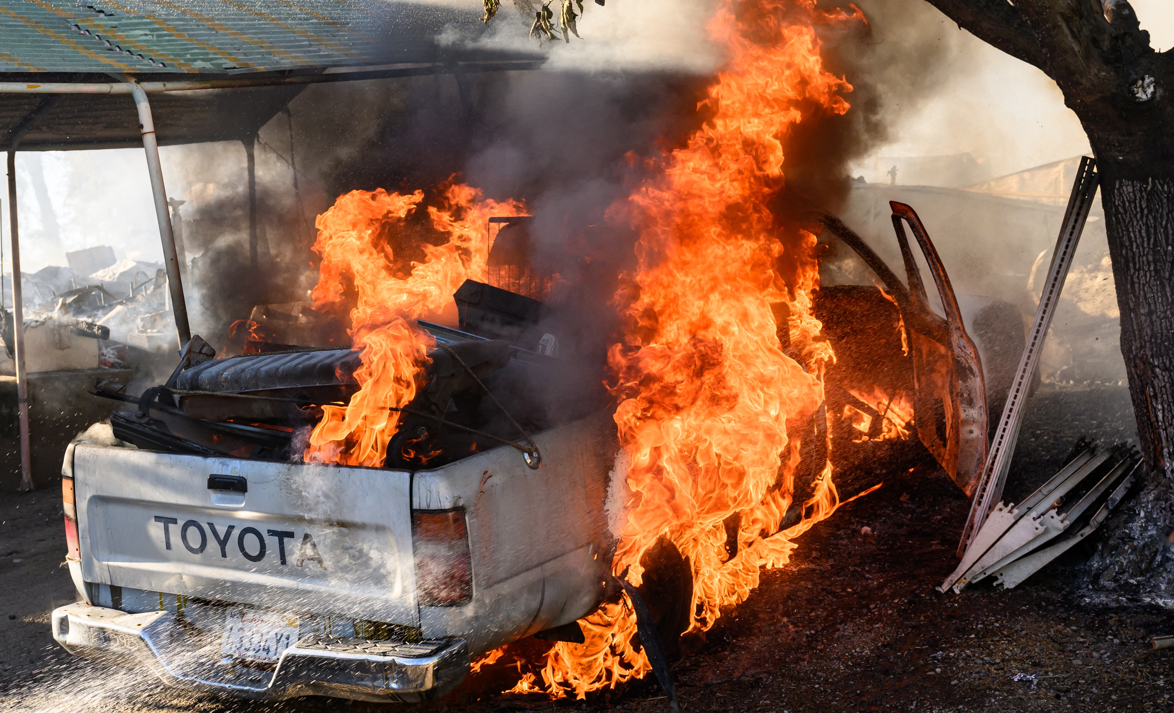 A truck burns outside a residence as the Boyles Fire burns in Clearlake, California, on September 8, 2024. The fire has thus far burned at least 30 homes and is being investigated for arson. (Photo by Josh Edelson/AFP Photo)