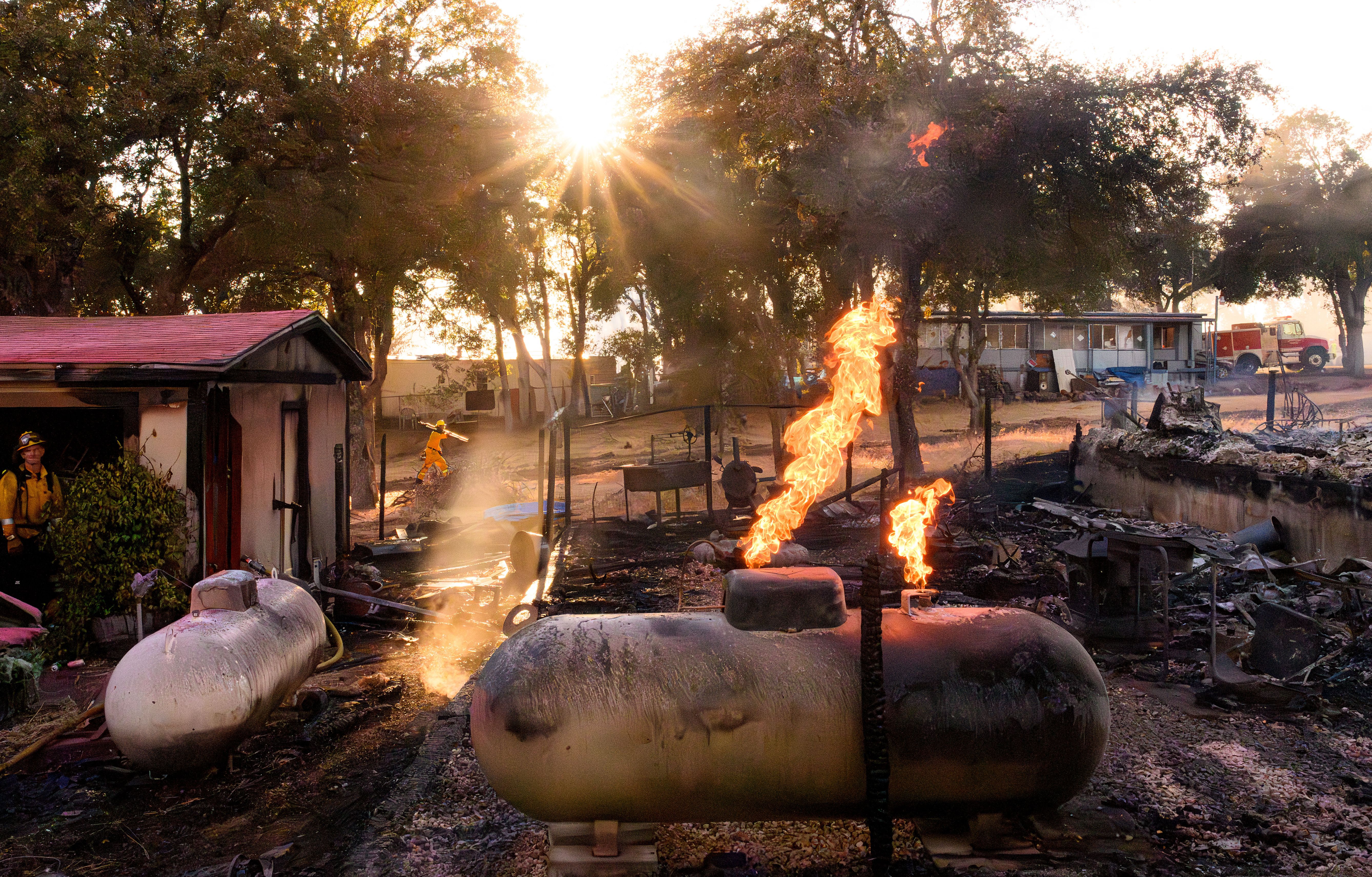 Flames emerge from a propane tank near a smoldering property as the Boyles Fire burns in Clearlake, California, on September 8, 2024. The fire has thus far burned at least 30 homes and is being investigated for arson. (Photo by Josh Edelson/AFP Photo)