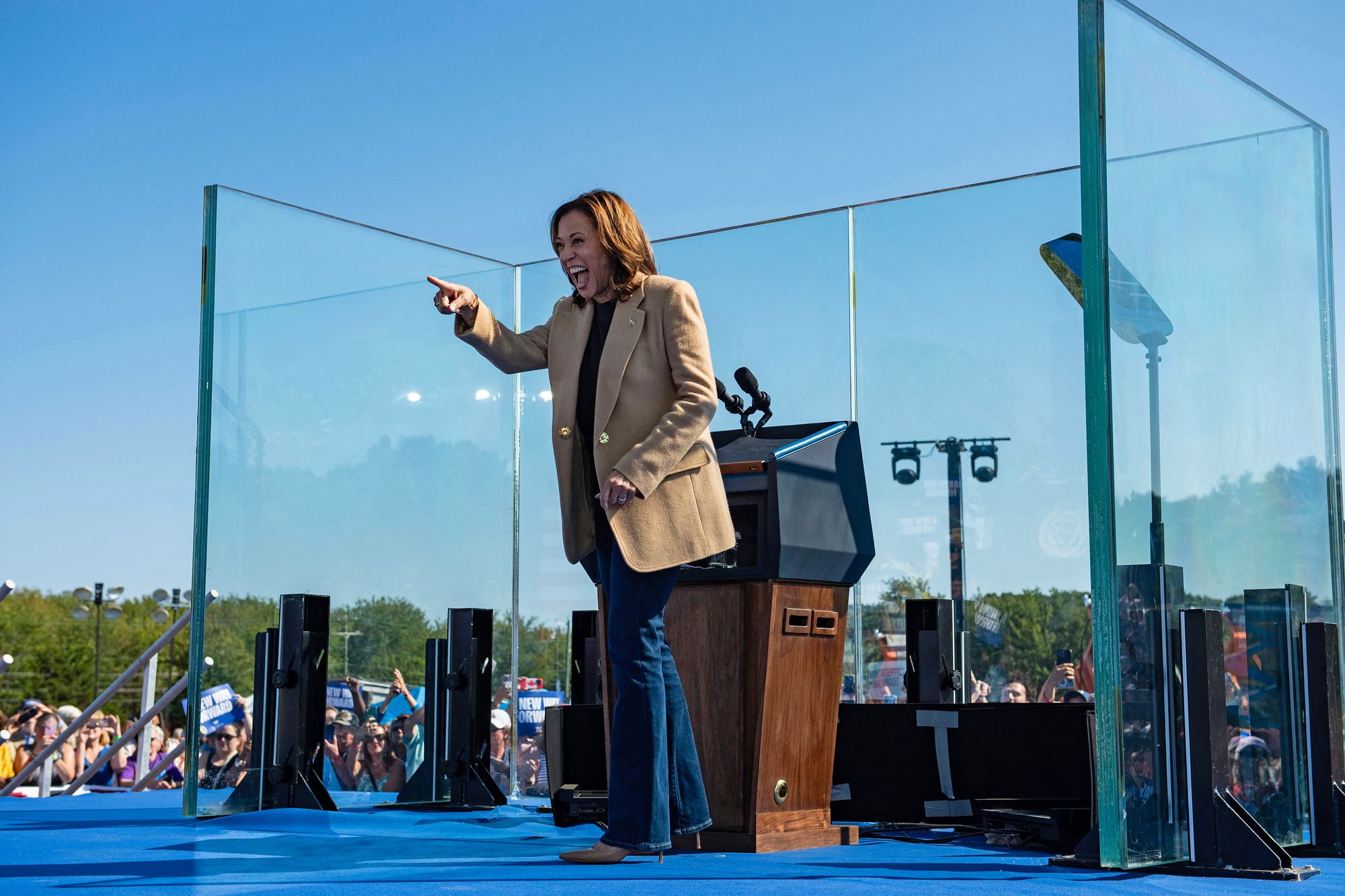 US Vice President and Democratic presidential candidate Kamala Harris gestures as she arrives to speak at a campaign event at the Throwback Brewery, in North Hampton, New Hampshire, on September 4, 2024. (Photo by Joseph Prezioso/AFP Photo)