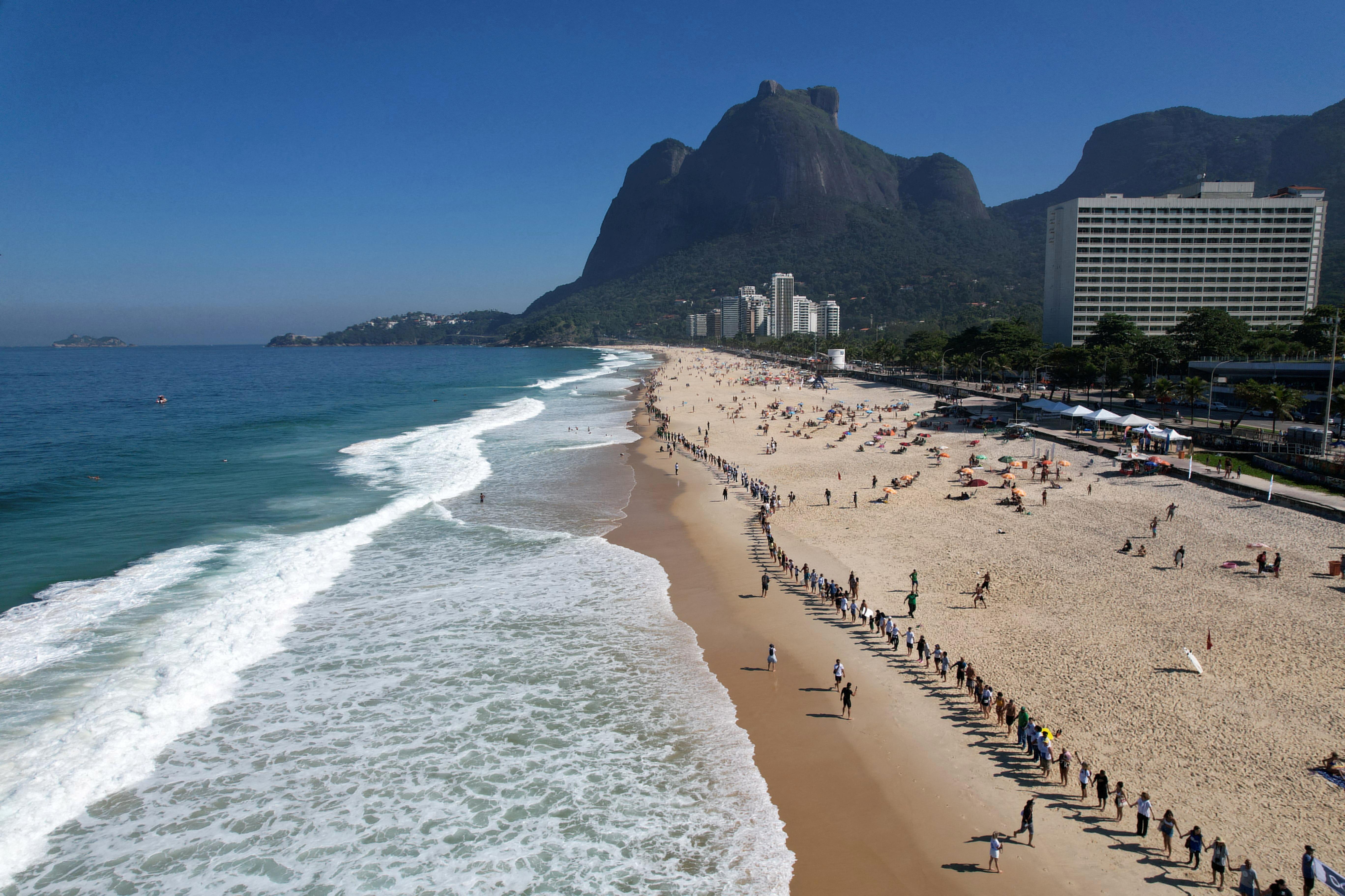 People attend a symbolic ritual named “Aquele Abraco” (That Hug), which represents a hug to the ocean, marking the World Oceans Day, at Sao Conrado beach in Rio de Janeiro, Brazil on June 8, 2023. (Photo by Pilar Olivares/Reuters)