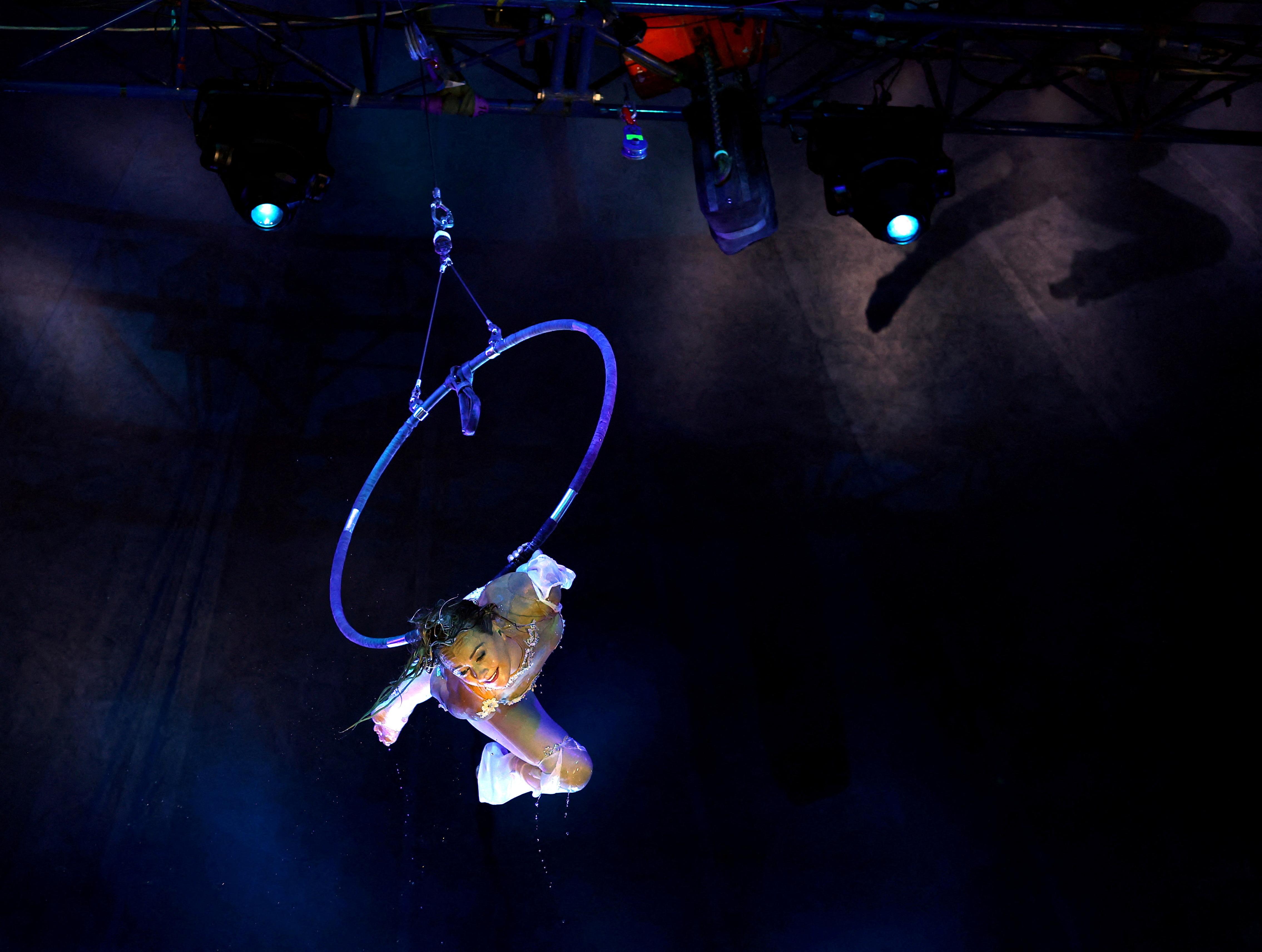 Laura Miller is pictured during her aquatic performance at the photocall for Circus Extreme in Leeds, Britain on June 14, 2023. (Photo by Lee Smith/Reuters)