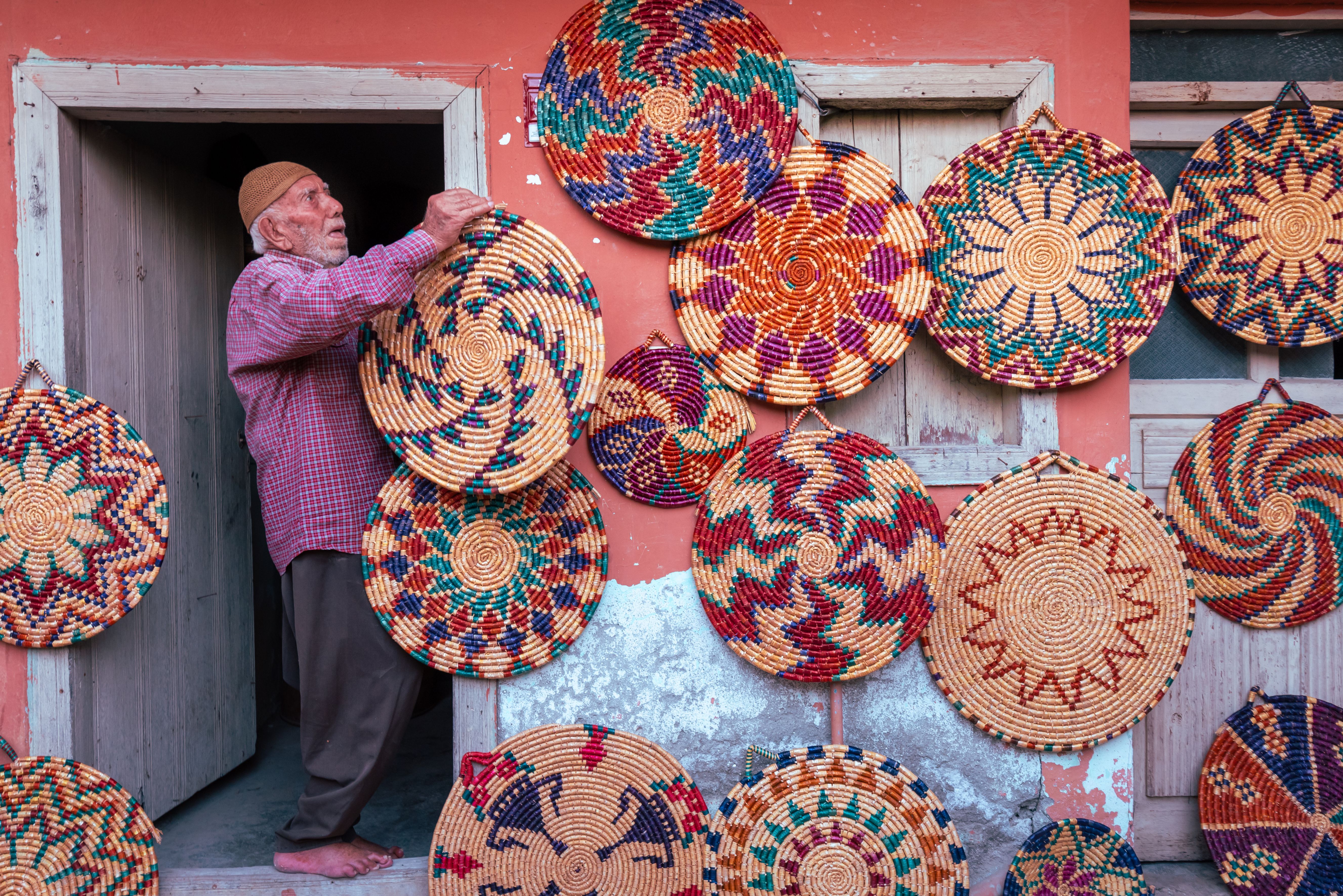 90 years old Niyazi Koleoglu weaves wicker from wheat stalks for 65 years in Altinkaya village in Hatay's Altinozu district, Turkiye on August 16, 2024. Koleoglu, who continues to weave wicker despite his advanced age, colors the wheat stalks collected from the fields at harvest time with the help of root dye. The colored and dried wheat stalks turn into art in his hands. (Photo by Meric Aktar/Anadolu via Getty Images)
