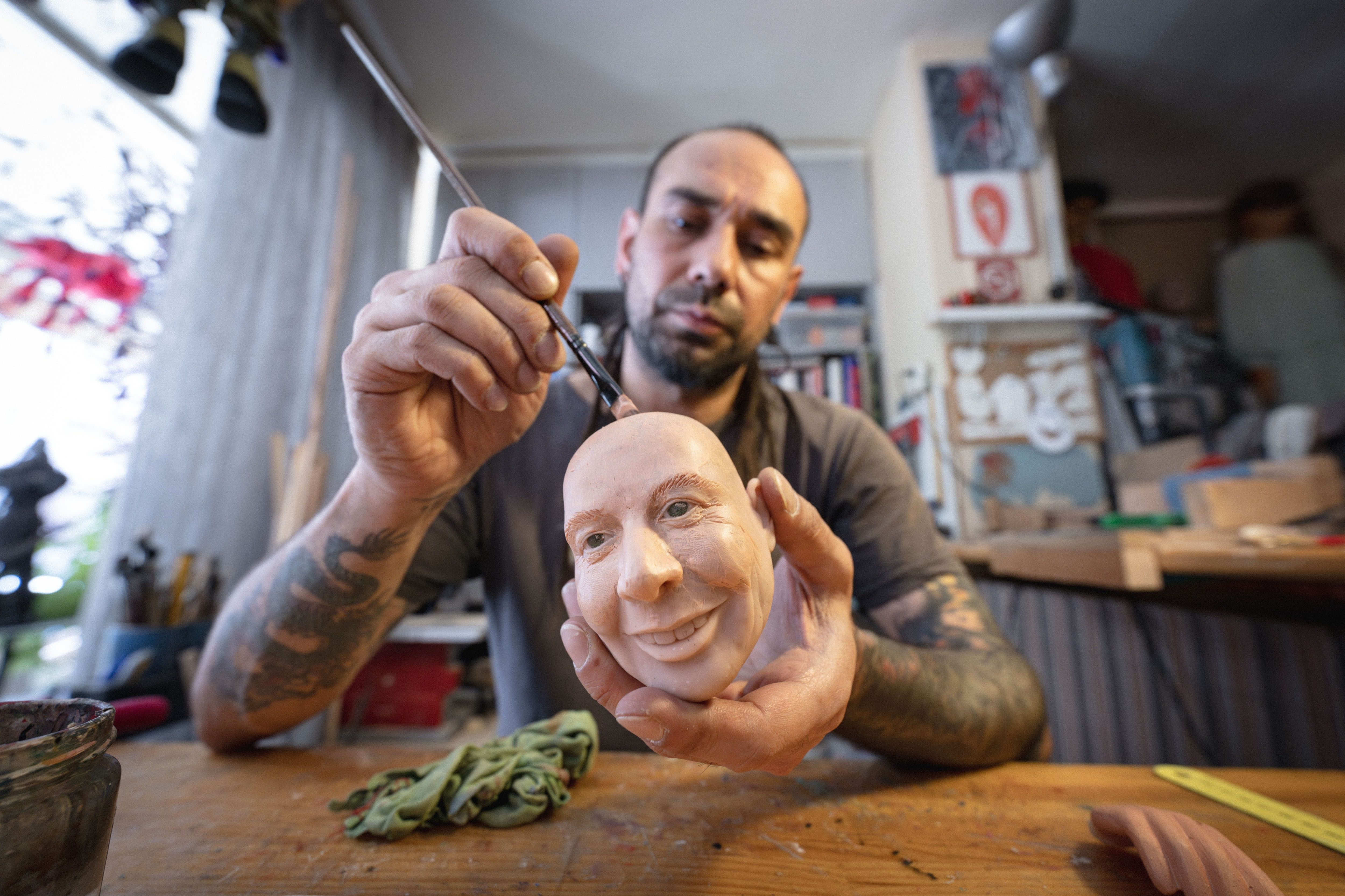 Puppet maker Cagdas Cakmak, who has created many special designs from real characters to fantastic characters, designs the puppet of Elon Musk, the owner of companies; Tesla, SpaceX and X, after 20 days of work in Ankara, Turkiye on August 20, 2024. Cagdas Cakmak, who started his puppetry adventure with the gift his brother brought from Prague, sends his special designs to countries such as the USA, England and Sweden. (Photo by Betul Abali/Anadolu via Getty Images)